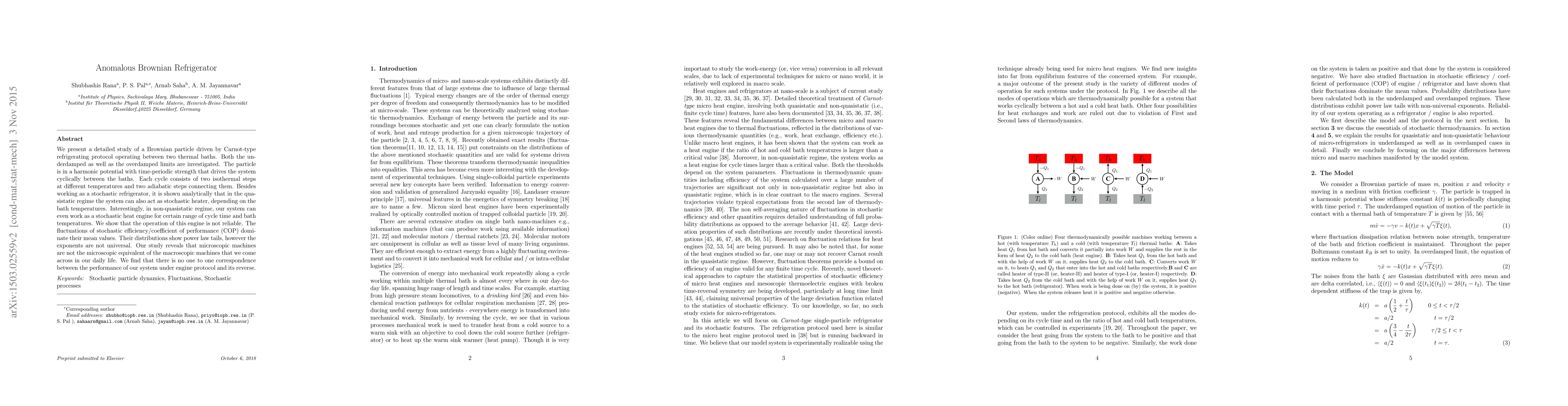 We present a detailed study of a Brownian particle driven by Carnot-type refrigerating protocol operating between two thermal baths. Both the underdamped as well as the overdamped limits are investigated. The particle is in a harmonic potential with time-periodic strength that drives the particle cyclically between the baths. Each cycle consists of two isothermal steps at different temperatures and two adiabatic steps connecting them. Besides working as a stochastic refrigerator, it is shown analytically that in the quasistatic regime the system can also act as stochastic heater, depending on the bath temperatures. Interestingly, in non-quasistatic regime, our system can even work as a stochastic heat engine for certain range of cycle time and bath temperatures. We show that the operation of this engine is not reliable. The fluctuations of stochastic efficiency/coefficient of performance (COP) dominate their mean values. Their distributions show power law tails, however the exponents are not universal. Our study reveals that microscopic machines are not the microscopic equivalent of the macroscopic machines that we come across in our daily life. We find that there is no one to one correspondence between the performance of our system under engine protocol and its reverse.