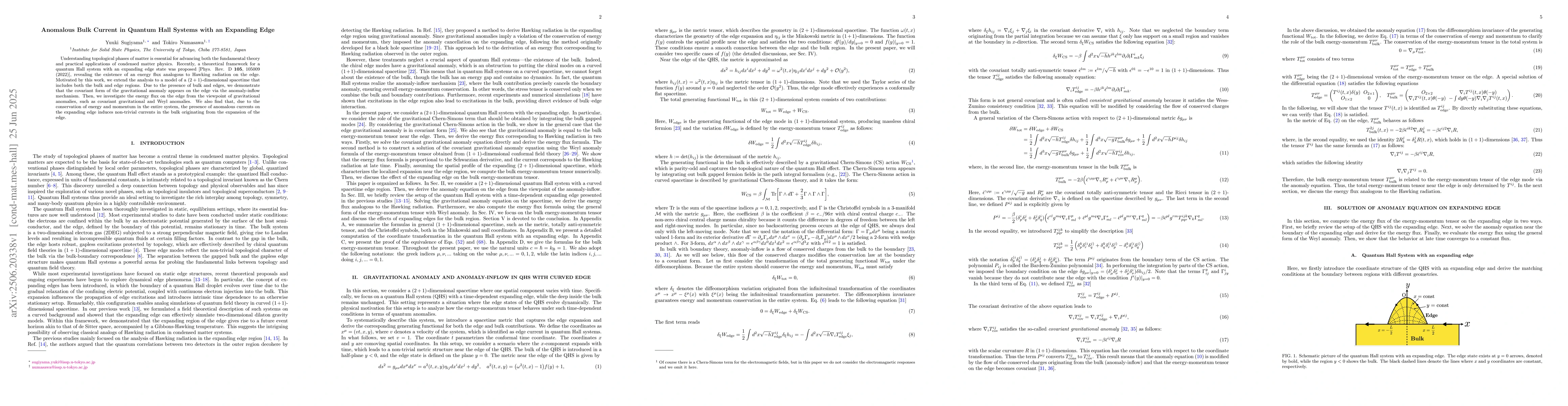 Understanding topological phases of matter is essential for advancing both the fundamental theory and practical applications of condensed matter physics. Recently, a theoretical framework for a quantum Hall system with an expanding edge state was proposed [Phys. Rev. D {\bf 105}, 105009 (2022)], revealing the existence of an energy flux analogous to Hawking radiation on the edge. Motivated by this work, we extend the analysis to a model of a $(2+1)$-dimensional spacetime that includes both the bulk and edge regions. Due to the presence of bulk and edges, we demonstrate that the covariant form of the gravitational anomaly appears on the edge via the anomaly-inflow mechanism. Then, we investigate the energy flux on the edge from the viewpoint of gravitational anomalies, such as covariant gravitational and Weyl anomalies. We also find that, due to the conservation of energy and momentum in the entire system, the presence of anomalous currents on the expanding edge induces non-trivial currents in the bulk originating from the expansion of the edge.