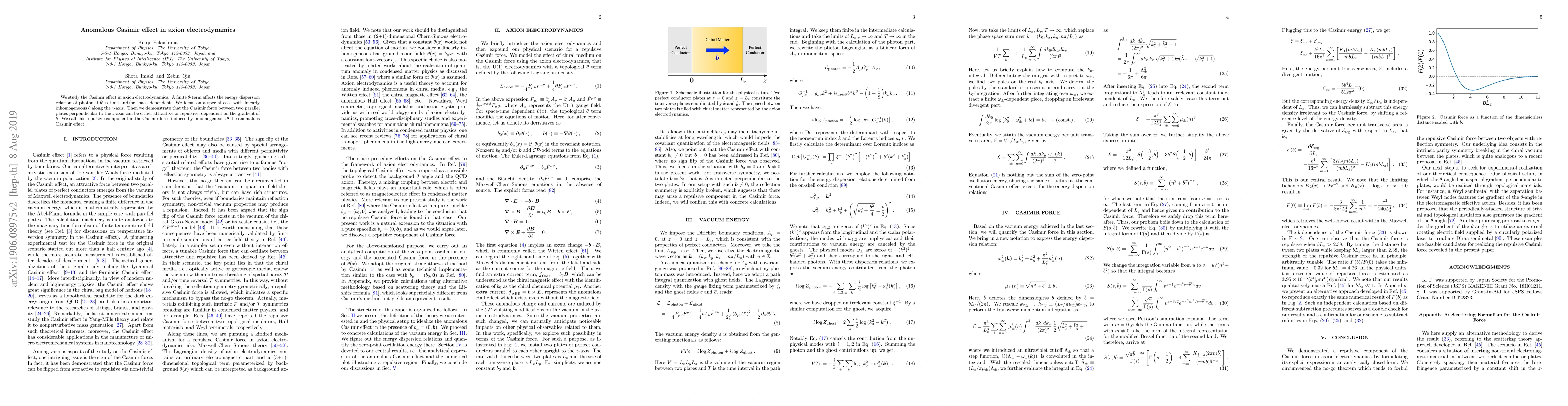This research investigates the Casimir effect in axion electrodynamics, demonstrating that a time- or space-dependent $\theta$-term can alter photon dispersion, leading to an anomalous Casimir effect where the force between parallel plates can be either attractive or repulsive depending on the gradient of $\theta$.
