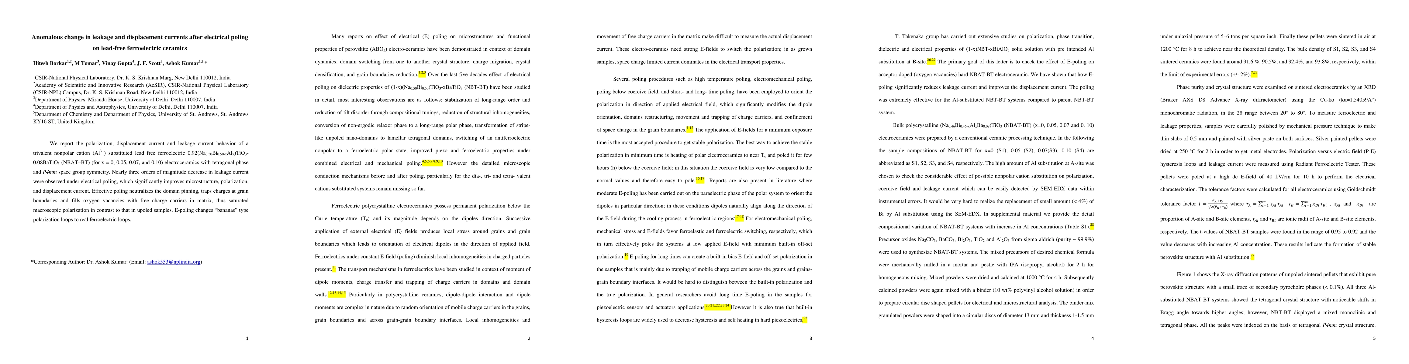 This study investigates the electrical behavior of Al-substituted lead-free ferroelectric NBT-BT ceramics, showing a significant reduction in leakage current by three orders of magnitude after electrical poling. The poling process enhances microstructure, polarization, and displacement current by neutralizing domain pinning and filling oxygen vacancies.