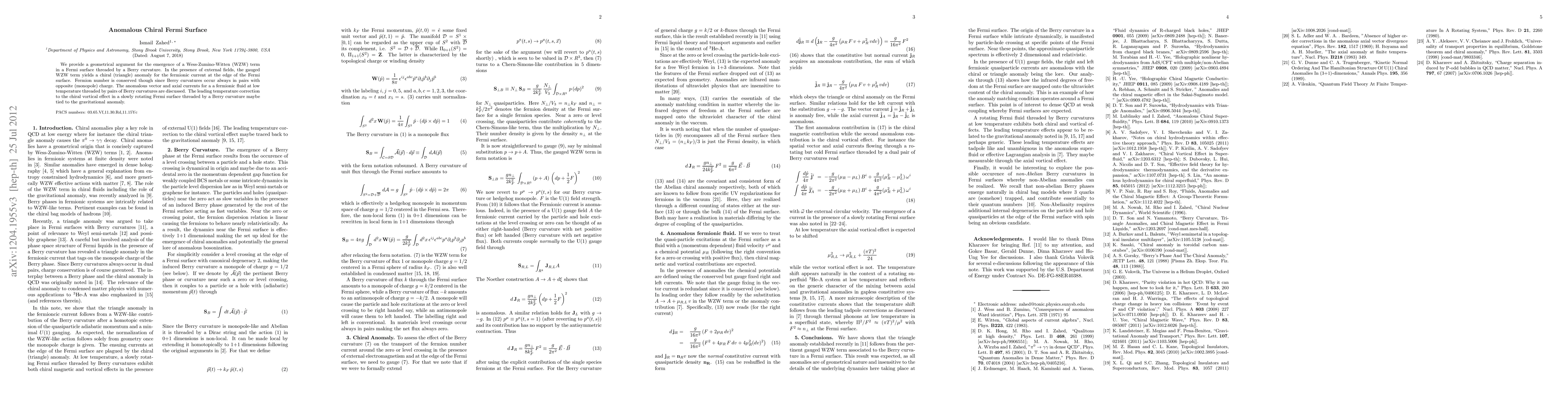 This paper argues geometrically for the emergence of a Wess-Zumino-Witten term linked to a Fermi surface influenced by Berry curvature, leading to a chiral anomaly in fermionic currents. Despite the anomaly, fermion number is conserved due to paired Berry curvatures.