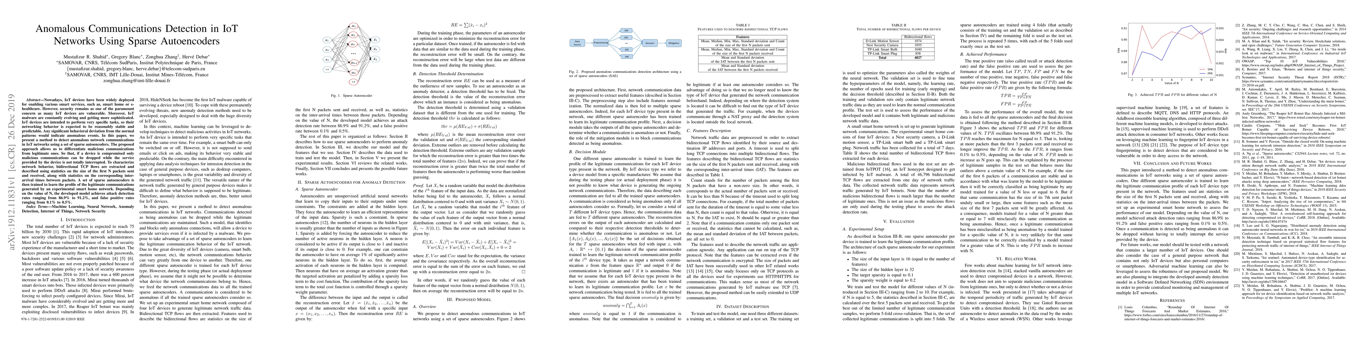 This paper proposes a method using sparse autoencoders to detect anomalous communications in IoT networks, leveraging statistical features from bidirectional TCP flows. The model achieves high detection rates (86.9%-91.2%) and low false positive rates (0.1%-0.5%) for identifying malicious communications without disrupting legitimate device services.