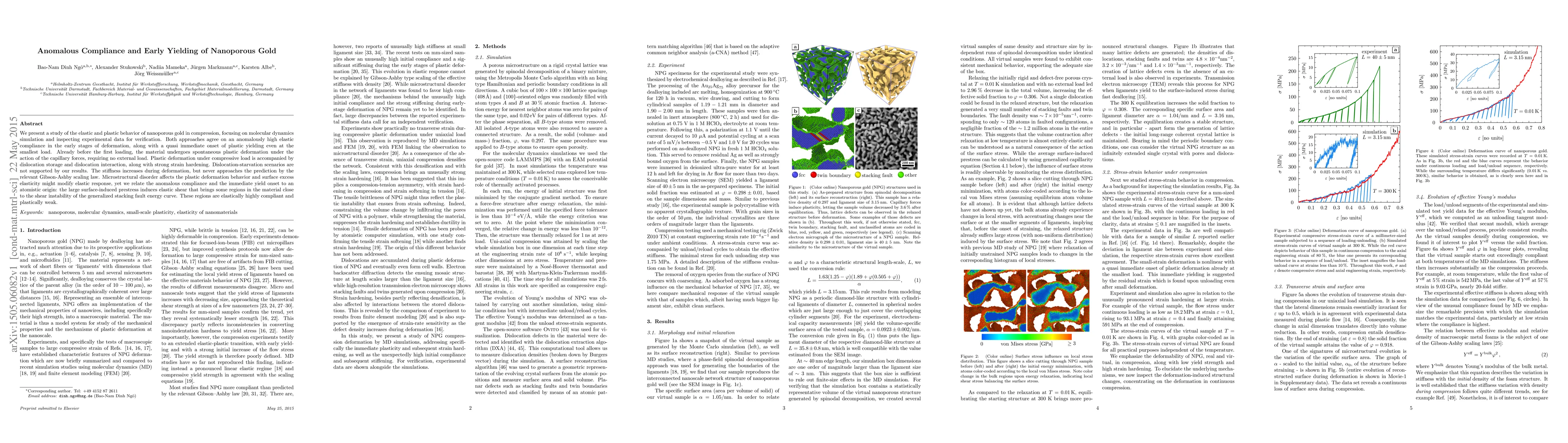 This study reveals that nanoporous gold exhibits unusually high elastic compliance and early plastic yielding under compression, with spontaneous plastic deformation occurring even before external loading due to capillary forces. The material's anomalous behavior is attributed to large surface-induced prestress causing elastic shear, making certain regions highly compliant and prone to early yielding.