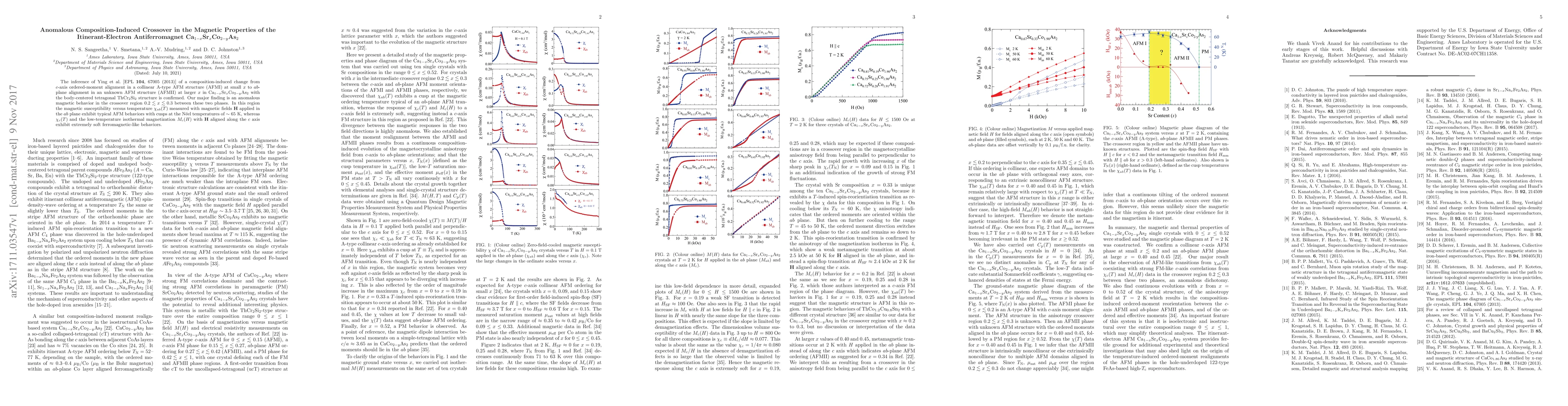 This study confirms a composition-induced magnetic phase transition in Ca(1-x)Sr(x)Co(2-y)As(2) from collinear AFMI to unknown AFMII, revealing anomalous magnetic behavior in the crossover region 0.2 < x < 0.3, characterized by soft ferromagnetic-like properties along the c-axis despite typical AFM behavior in the ab-plane.