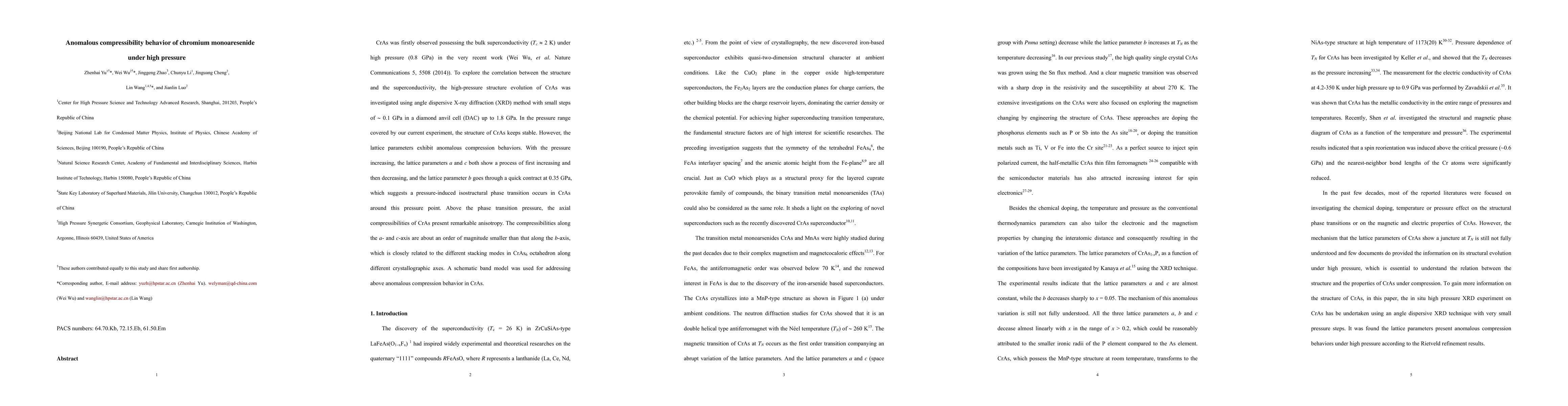 Researchers studied chromium monoaresenide under high pressure and found it exhibits anomalous compression behavior, with lattice parameters first increasing then decreasing, before undergoing a phase transition around 0.35 GPa.