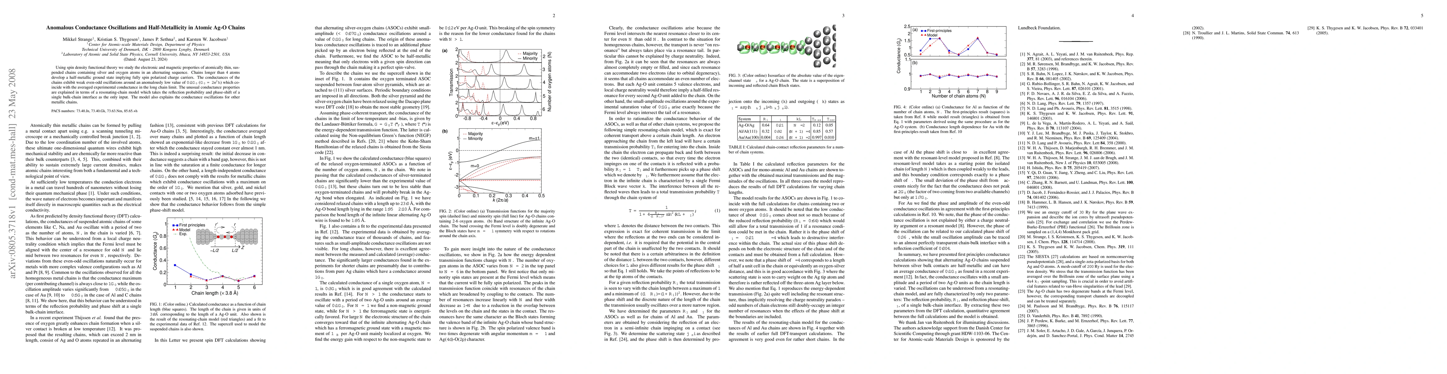 The research utilizes spin density functional theory to study thin, suspended Ag-O atomic chains, finding that chains longer than 4 atoms exhibit half-metallicity with fully spin-polarized charge carriers. Conductance oscillations are observed, explained by a resonating-chain model, with values lower than expected and coinciding with experimental long-chain conductance.