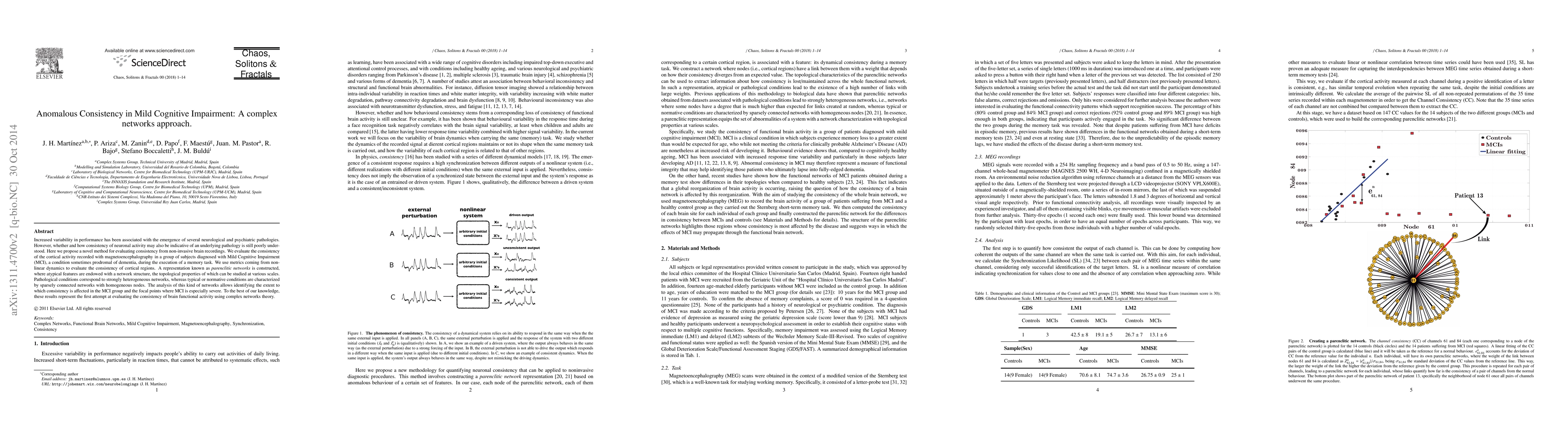 Increased variability in performance has been associated with the emergence of several neurological and psychiatric pathologies. However, whether and how consistency of neuronal activity may also be indicative of an underlying pathology is still poorly understood. Here we propose a novel method for evaluating consistency from non-invasive brain recordings. We evaluate the consistency of the cortical activity recorded with magnetoencephalography in a group of subjects diagnosed with Mild Cognitive Impairment (MCI), a condition sometimes prodromal of dementia, during the execution of a memory task. We use metrics coming from nonlinear dynamics to evaluate the consistency of cortical regions. A representation known as (parenclitic networks) is constructed, where atypical features are endowed with a network structure, the topological properties of which can be studied at various scales. Pathological conditions correspond to strongly heterogeneous networks, whereas typical or normative conditions are characterized by sparsely connected networks with homogeneous nodes. The analysis of this kind of networks allows identifying the extent to which consistency is affecting the MCI group and the focal points where MCI is specially severe. To the best of our knowledge, these results represent the first attempt at evaluating the consistency of brain functional activity using complex networks theory.
