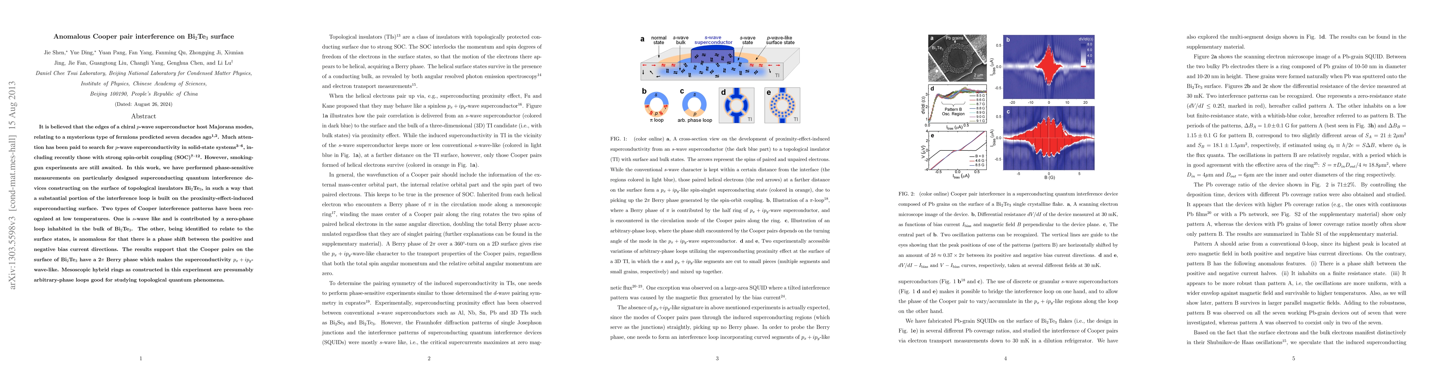 This study investigates anomalous Cooper pair interference on Bi2Te3 surface, revealing two distinct interference patterns. The findings suggest that the surface states exhibit p_x+ip_y-wave superconductivity, characterized by a 2π Berry phase, supporting the presence of Majorana modes.