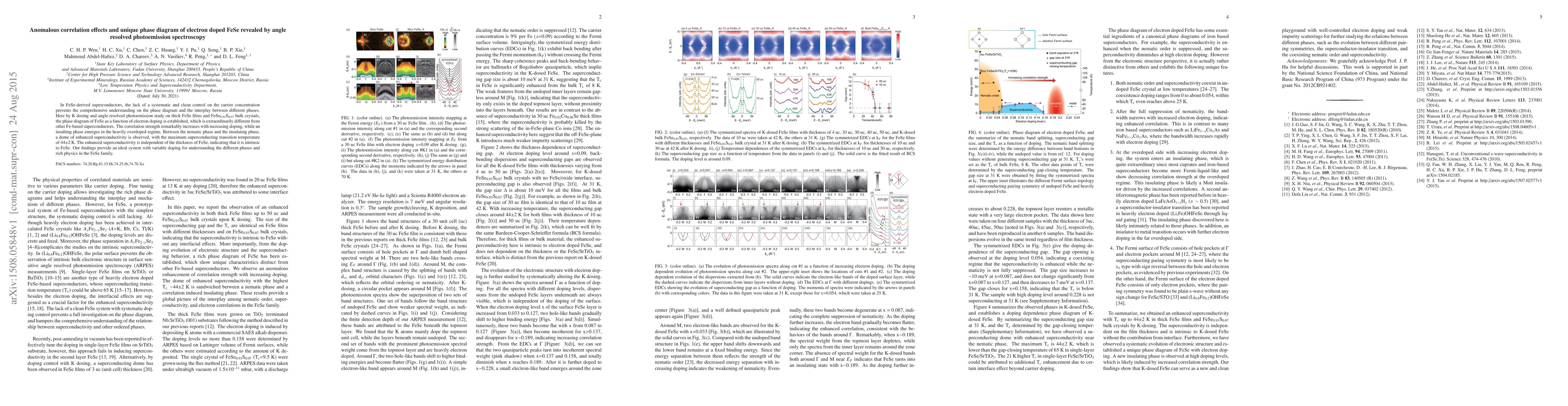This study establishes the unique phase diagram of electron-doped FeSe using angle-resolved photoemission spectroscopy, revealing increased correlation strength and anomalous superconductivity up to 44±2 K, with an insulating phase emerging in heavily overdoped conditions. The findings highlight FeSe as an exceptional system for exploring phase interactions in Fe-based superconductors.