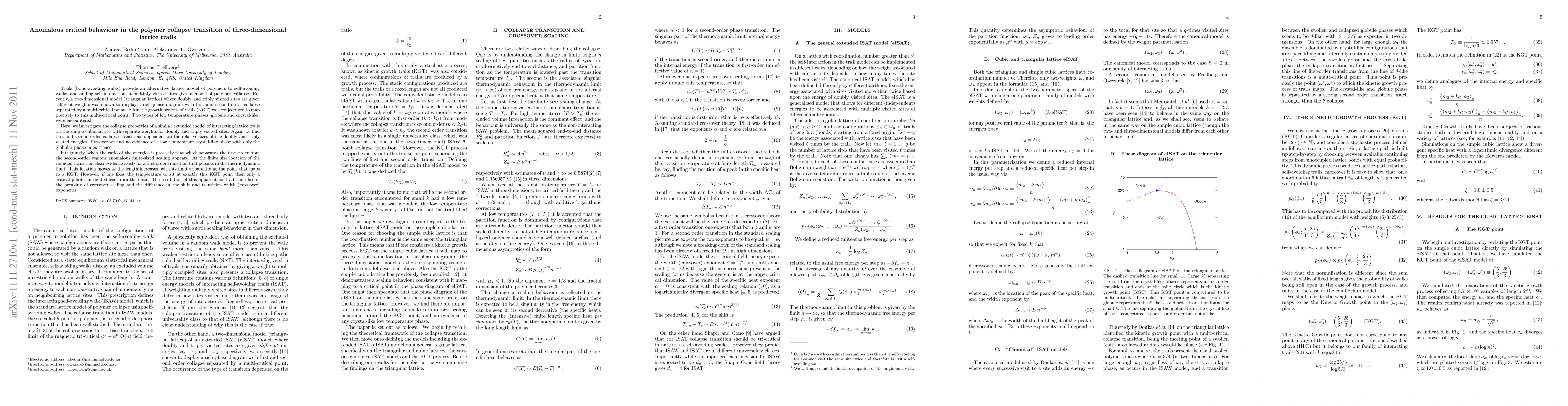 Trails (bond-avoiding walks) provide an alternative lattice model of polymers to self-avoiding walks, and adding self-interaction at multiply visited sites gives a model of polymer collapse. Recently, a two-dimensional model (triangular lattice) where doubly and triply visited sites are given different weights was shown to display a rich phase diagram with first and second order collapse separated by a multi-critical point. A kinetic growth process of trails (KGT) was conjectured to map precisely to this multi-critical point. Two types of low temperature phases, globule and crystal-like, were encountered. Here, we investigate the collapse properties of a similar extended model of interacting lattice trails on the simple cubic lattice with separate weights for doubly and triply visited sites. Again we find first and second order collapse transitions dependent on the relative sizes of the doubly and triply visited energies. However we find no evidence of a low temperature crystal-like phase with only the globular phase in existence. Intriguingly, when the ratio of the energies is precisely that which separates the first order from the second-order regions anomalous finite-sized scaling appears. At the finite size location of the rounded transition clear evidence exists for a first order transition that persists in the thermodynamic limit. This location moves as the length increases, with its limit apparently at the point that maps to a KGT. However, if one fixes the temperature to sit at exactly this KGT point then only a critical point can be deduced from the data. The resolution of this apparent contradiction lies in the breaking of crossover scaling and the difference in the shift and transition width (crossover) exponents.