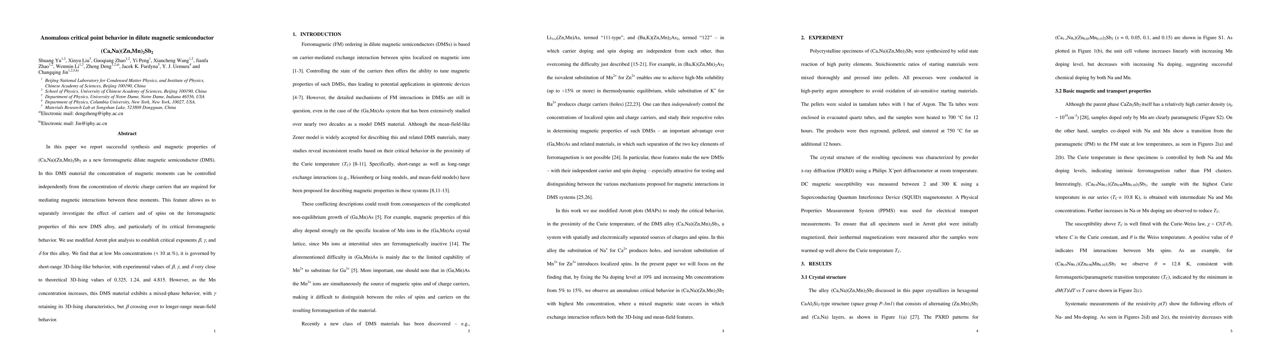 In this paper we report successful synthesis and magnetic properties of (Ca,Na)(Zn,Mn)2Sb2 as a new ferromagnetic dilute magnetic semiconductor (DMS). In this DMS material the concentration of magnetic moments can be controlled independently from the concentration of electric charge carriers that are required for mediating magnetic interactions between these moments. This feature allows us to separately investigate the effect of carriers and of spins on the ferromagnetic properties of this new DMS alloy, and particularly of the critical ferromagnetic behavior. We use modified Arrott plot technique to establish critical exponents b, g, and d of this alloy. We find that at low Mn concentrations (< 10 at.%), it is governed by short-range 3D-Ising behavior, with experimental values of b, g, and d very close to theoretical 3D-Ising values of 0.325, 1.24, and 4.815. However, as the Mn concentration increases, this DMS material exhibits a mixed-phase behavior, with g retaining its 3D-Ising characteristics, but b crossing over to longer-range mean-field behavior.