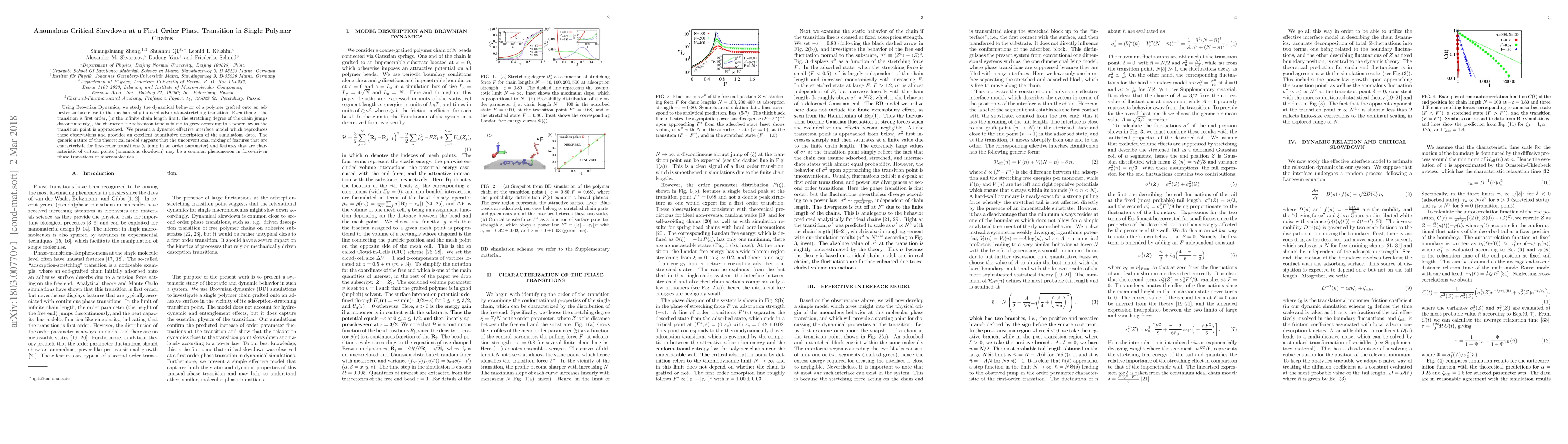 Using Brownian Dynamics, we study the dynamical behavior of a polymer grafted onto an adhesive surface close to the mechanically induced adsorption-stretching transition. Even though the transition is first order, (in the infinite chain length limit, the stretching degree of the chain jumps discontinuously), the characteristic relaxation time is found to grow according to a power law as the transition point is approached. We present a dynamic effective interface model which reproduces these observations and provides an excellent quantitaive description of the simulations data. The generic nature of the theoretical model suggests that the unconventional mixing of features that are characteristic for first-order transitions (a jump in an order parameter) and features that are characteristic of critical points (anomalous slowdown) may be a common phenomenon in force-driven phase transitions of macromolecules.