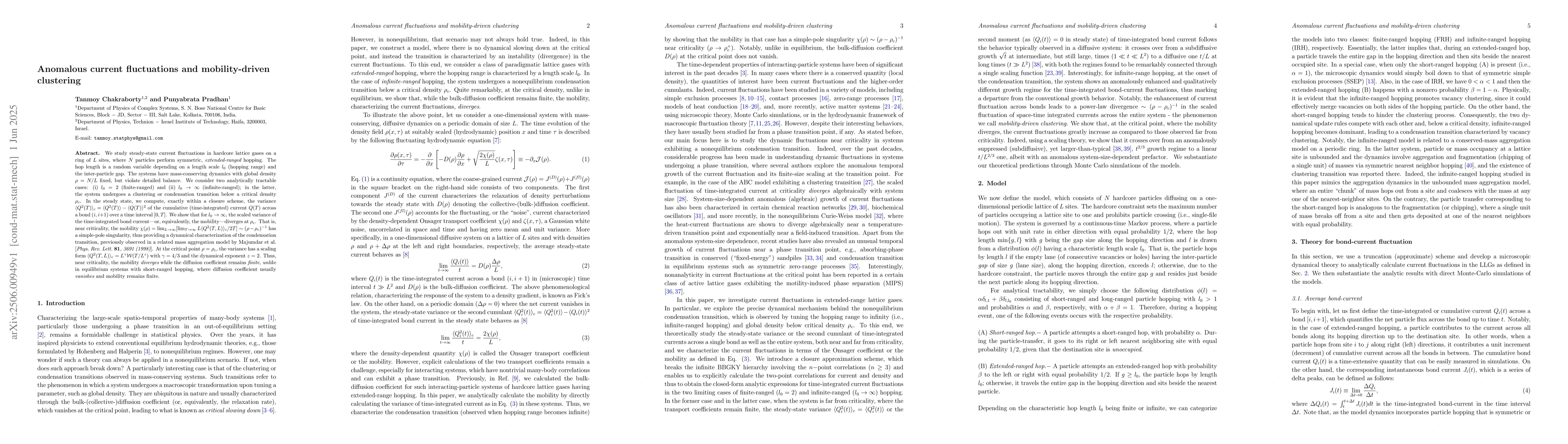 The paper presents exact analytical computations for steady-state current fluctuations in hardcore lattice gases with extended-ranged hopping, demonstrating a dynamical characterization of a condensation transition via mobility divergence.