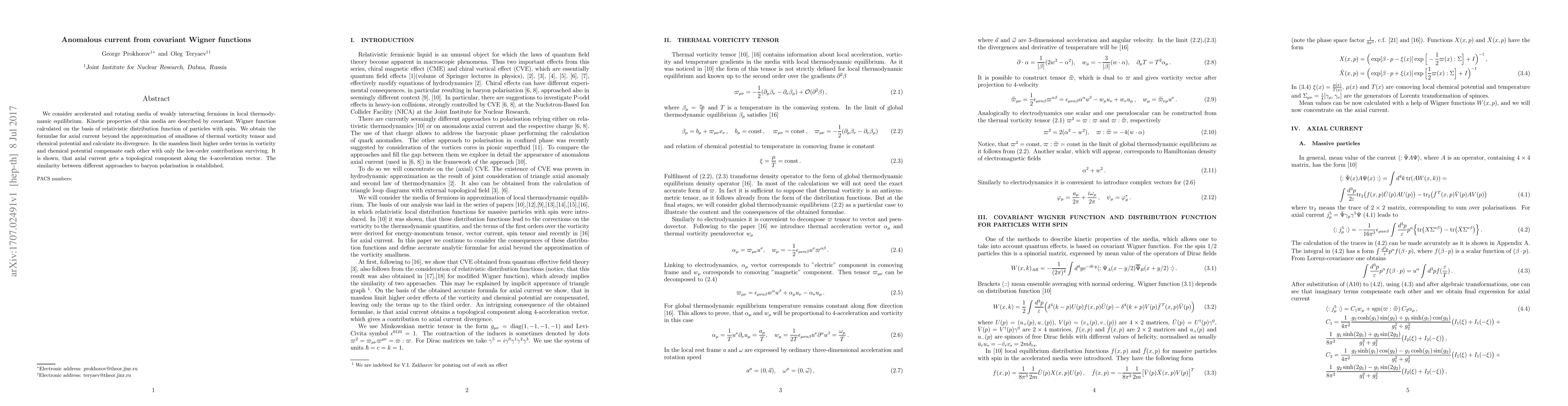 We consider accelerated and rotating media of weakly interacting fermions in local thermodynamic equilibrium. Kinetic properties of this media are described by covariant Wigner function calculated on the basis of relativistic distribution function of particles with spin. We obtain the formulae for axial current beyond the approximation of smallness of thermal vorticity tensor and chemical potential and calculate its divergence. In the massless limit higher order terms in vorticity and chemical potential compensate each other with only the low-order contributions surviving. It is shown, that axial current gets a topological component along the 4-acceleration vector. The similarity between different approaches to baryon polarisation is established.