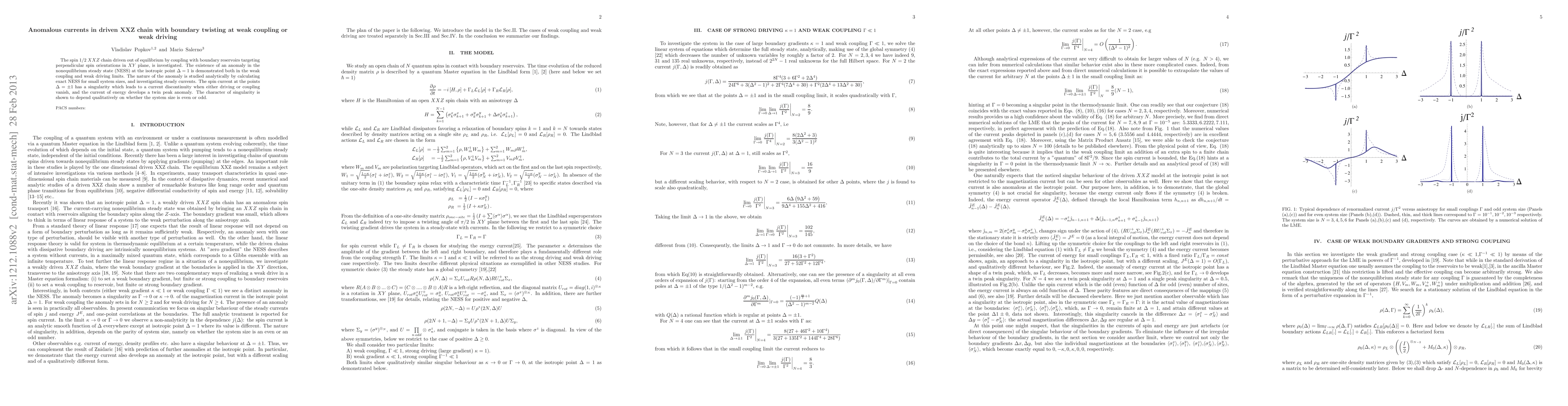 The paper investigates the spin 1/2 XXZ chain driven out of equilibrium by boundary reservoirs, demonstrating an anomaly in the nonequilibrium steady state at $\Delta=1$ under weak coupling and driving. The study reveals singularities in spin currents and a twin peak anomaly in energy currents, with the nature of the singularity depending on the system size parity.
