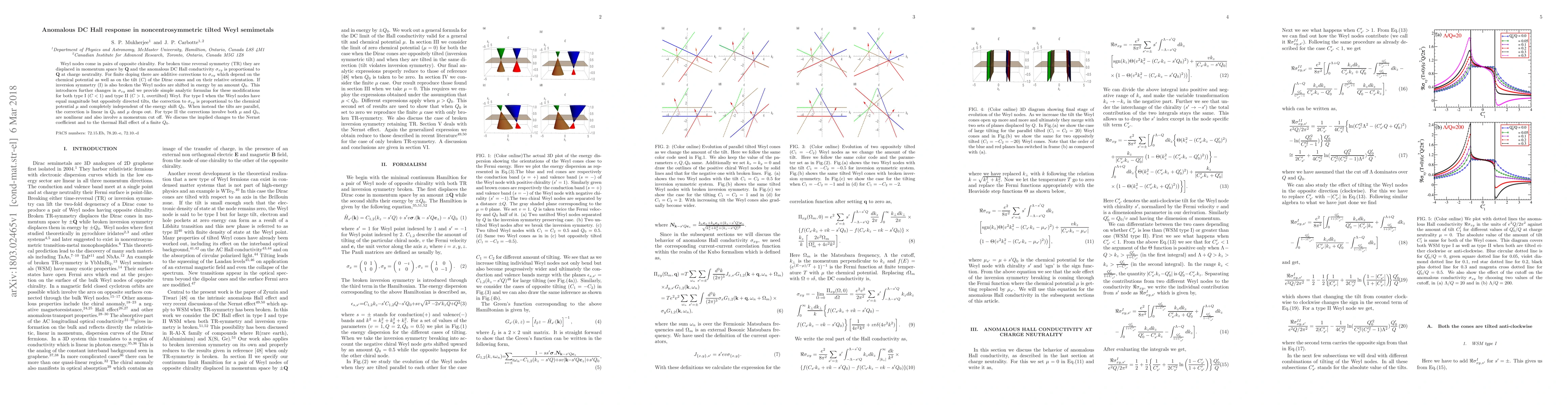 Weyl nodes come in pairs of opposite chirality. For broken time reversal symmetry (TR) they are displaced in momentum space by $\bf{Q}$ and the anomalous DC Hall conductivity $\sigma_{xy}$ is proportional to $\bf{Q}$ at charge neutrality. For finite doping there are additive corrections to $\sigma_{xy}$ which depend on the chemical potential as well as on the tilt ($C$) of the Dirac cones and on their relative orientation. If inversion symmetry (I) is also broken the Weyl nodes are shifted in energy by an amount $Q_{0}$. This introduces further changes in $\sigma_{xy}$ and we provide simple analytic formulas for these modifications for both type I ($C<1$) and type II ($C>1$, overtilted) Weyl. For type I when the Weyl nodes have equal magnitude but oppositely directed tilts, the correction to $\sigma_{xy}$ is proportional to the chemical potential $\mu$ and completely independent of the energy shift $Q_{0}$. When instead the tilts are parallel, the correction is linear in $Q_{0}$ and $\mu$ drops out. For type II the corrections involve both $\mu$ and $Q_{0}$, are nonlinear and also involve a momentum cut off. We discuss the implied changes to the Nernst coefficient and to the thermal Hall effect of a finite $Q_{0}$.
