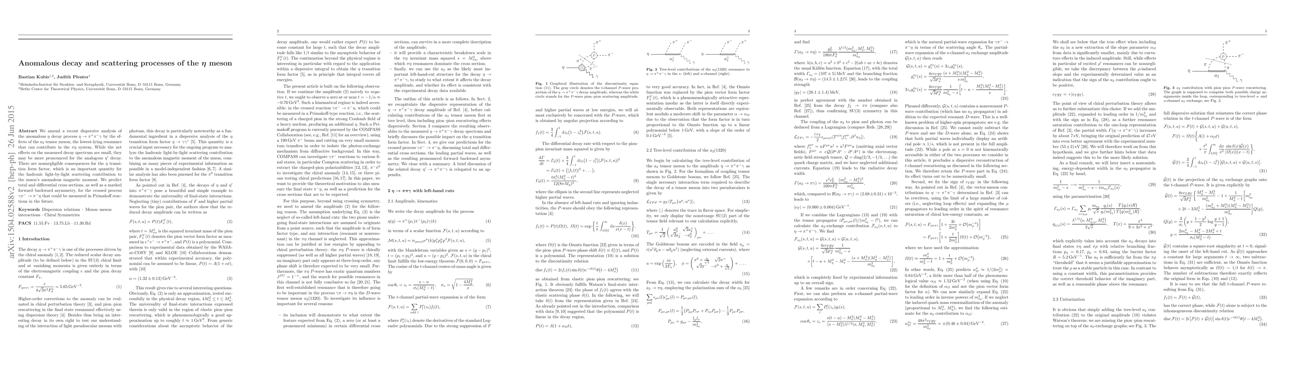 We amend a recent dispersive analysis of the anomalous $\eta$ decay process $\eta\to\pi^+\pi^-\gamma$ by the effects of the $a_2$ tensor meson, the lowest-lying resonance that can contribute in the $\pi\eta$ system. While the net effects on the measured decay spectrum are small, they may be more pronounced for the analogous $\eta'$ decay. There are nonnegligible consequences for the $\eta$ transition form factor, which is an important quantity for the hadronic light-by-light scattering contribution to the muon's anomalous magnetic moment. We predict total and differential cross sections, as well as a marked forward-backward asymmetry, for the crossed process $\gamma\pi^-\to\pi^-\eta$ that could be measured in Primakoff reactions in the future.