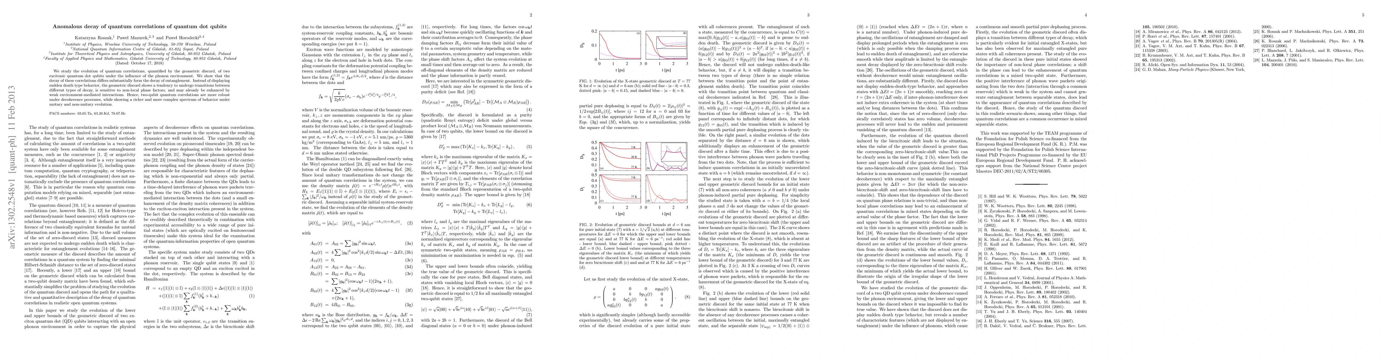 This paper investigates the evolution of quantum correlations, measured by geometric discord, in two excitonic quantum dot qubits influenced by a phonon environment. Unlike entanglement, the decay of geometric discord shows varied transitions, sensitivity to phase factors, and potential enhancement by weak interactions, indicating a more robust and complex behavior of quantum correlations under decoherence.