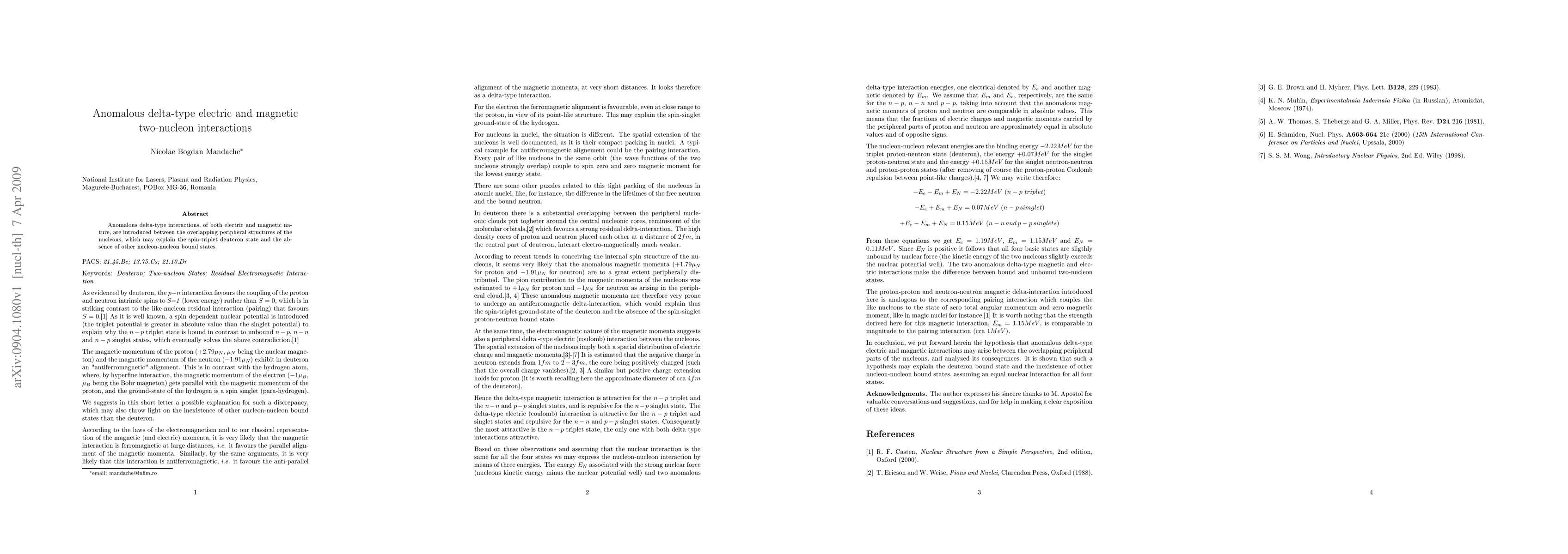 Anomalous delta-type interactions, of both electric and magnetic nature, are introduced between the overlapping peripheral structures of the nucleons, which may explain the spin-triplet deuteron state and the absence of other nucleon-nucleon bound states.