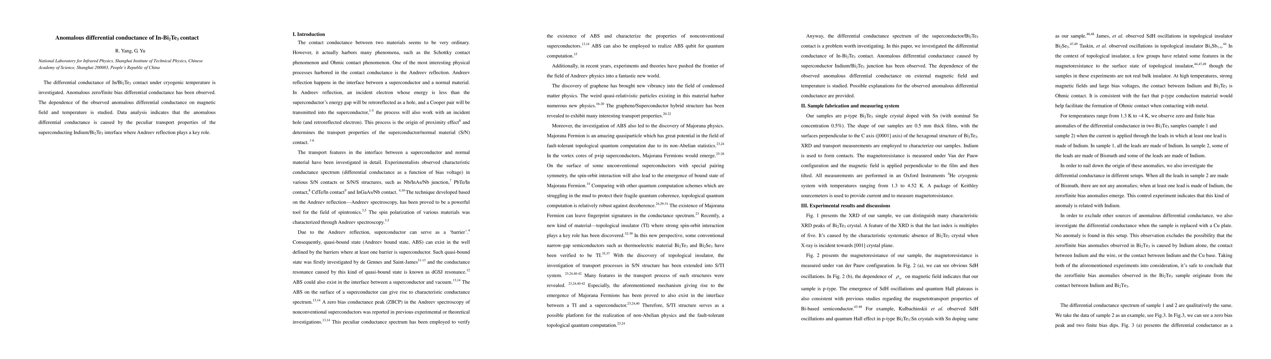 The differential conductance of In/Bi2Te3 contact under cryogenic temperature is investigated. Anomalous zero/finite bias differential conductance has been observed. The dependence of the observed anomalous differential conductance on magnetic field and temperature is studied. Data analysis indicates that the anomalous differential conductance is caused by the peculiar transport properties of the superconducting Indium/Bi2Te3 interface where Andreev reflection plays a key role.