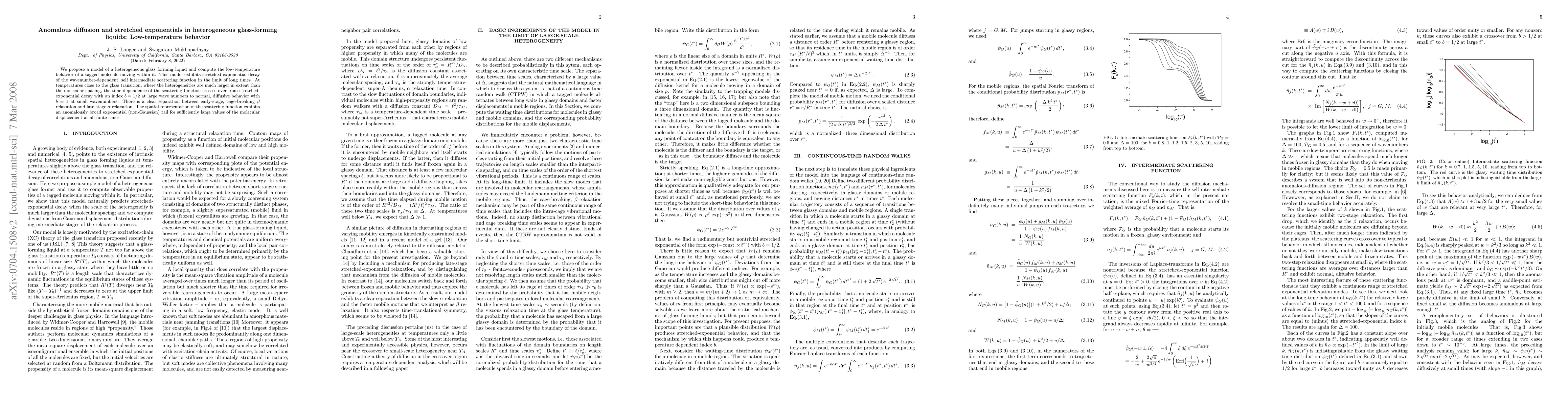 This paper models heterogeneous glass-forming liquids, showing that tagged molecules exhibit stretched-exponential decay in self intermediate scattering functions at low temperatures, transitioning from $b=1/2$ to $b=1$ with varying wave numbers. It distinguishes $\alpha$ and $\beta$ relaxations and finds an anomalously broad, non-Gaussian tail in the spatial representation of the scattering function.
