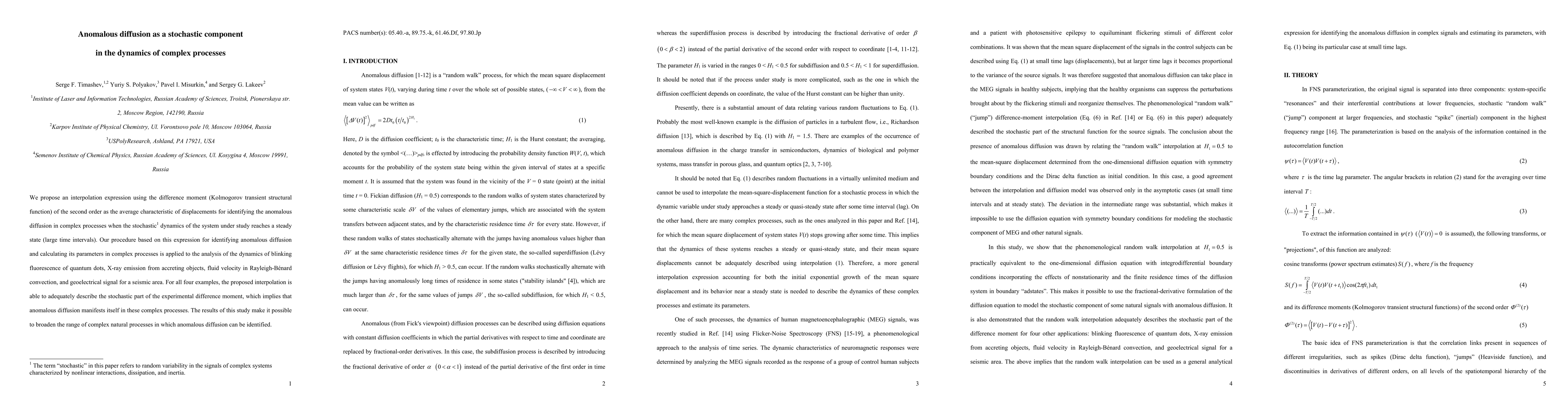 We propose an interpolation expression using the difference moment (Kolmogorov transient structural function) of the second order as the average characteristic of displacements for identifying the anomalous diffusion in complex processes when the stochastic dynamics of the system under study reaches a steady state (large time intervals). Our procedure based on this expression for identifying anomalous diffusion and calculating its parameters in complex processes is applied to the analysis of the dynamics of blinking fluorescence of quantum dots, X-ray emission from accreting objects, fluid velocity in Rayleigh-B\'enard convection, and geoelectrical signal for a seismic area. For all four examples, the proposed interpolation is able to adequately describe the stochastic part of the experimental difference moment, which implies that anomalous diffusion manifests itself in these complex processes. The results of this study make it possible to broaden the range of complex natural processes in which anomalous diffusion can be identified.