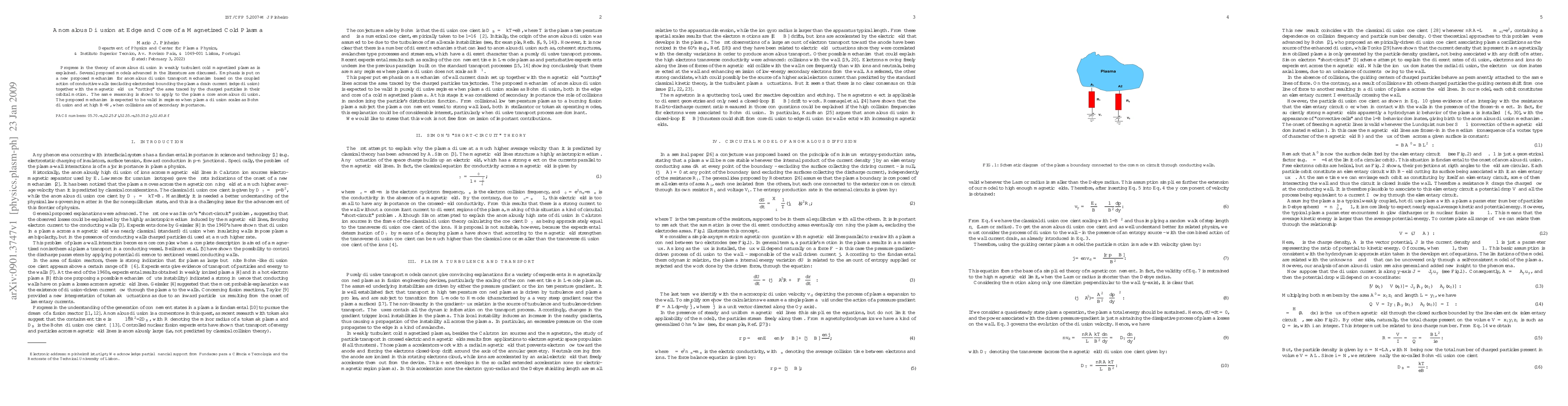 This paper discusses theoretical models for anomalous diffusion in weakly turbulent cold magnetized plasmas, proposing a new mechanism involving edge diffusion due to conductive walls and magnetic field flux "cutting" particle paths, which also applies to core diffusion, valid in regimes where Bohm diffusion dominates.
