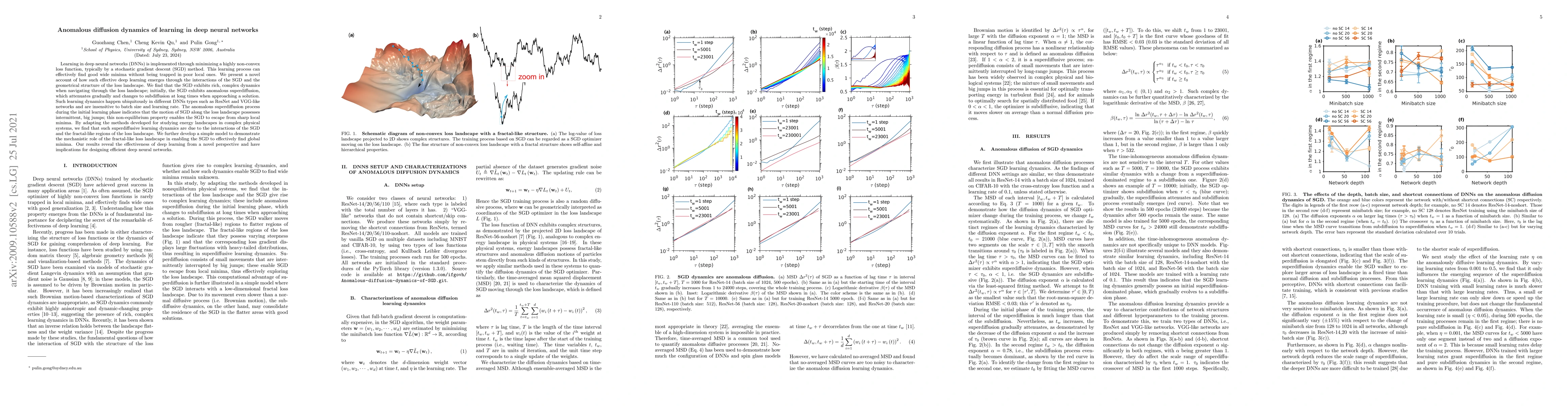This paper investigates the diffusion dynamics of learning in deep neural networks, revealing that stochastic gradient descent (SGD) exhibits anomalous superdiffusion initially, transitioning to subdiffusion, which aids in escaping local minima. The study finds this complex SGD behavior is due to interactions with the fractal-like structure of the loss landscape, providing insights into designing more efficient deep neural networks.