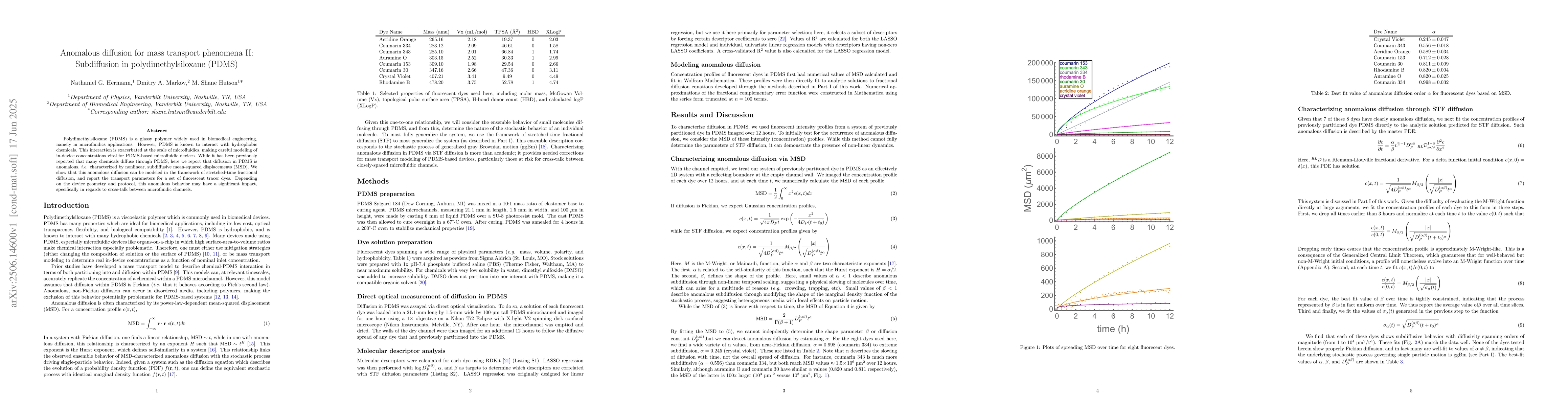 Polydimethylsiloxane (PDMS) is a glassy polymer widely used in biomedical engineering, namely in microfluidics applications. However, PDMS is known to interact with hydrophobic chemicals. This interaction is exacerbated at the scale of microfluidics, making careful modeling of in-device concentrations vital for PDMS-based microfluidic devices. While it has been previously reported that many chemicals diffuse through PDMS, here we report that diffusion in PDMS is anomalous, i.e. characterized by nonlinear, subdiffusive mean-squared displacements (MSD). We show that this anomalous diffusion can be modeled in the framework of stretched-time fractional diffusion, and report the transport parameters for a set of fluorescent tracer dyes. Depending on the device geometry and protocol, this anomalous behavior may have a significant impact, specifically in regards to cross-talk between microfluidic channels.