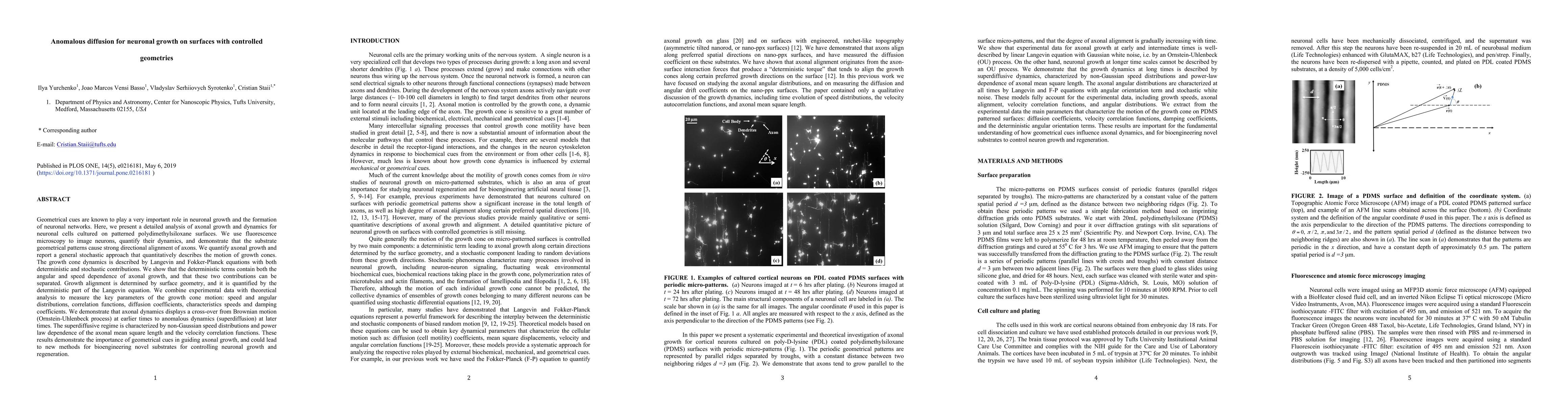 This study investigates how geometrical patterns on surfaces influence the directional alignment and dynamics of axonal growth in neurons, using fluorescence microscopy and theoretical models. The research reveals a transition from Brownian to anomalous diffusion in growth cones, highlighting the role of surface geometry in guiding neuronal growth and suggesting potential applications in bioengineering.