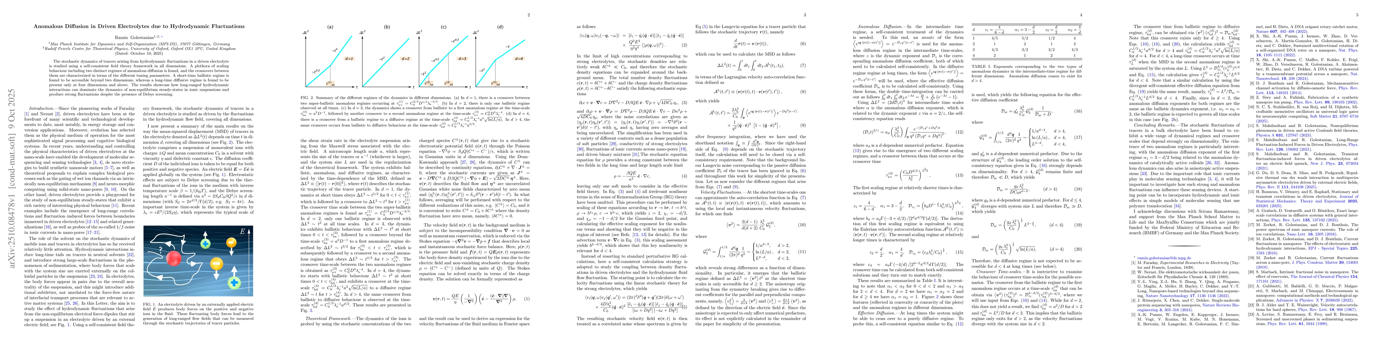 Development of a self-consistent framework to analyze hydrodynamic fluctuations and anomalous diffusion in driven electrolytes across different spatial dimensions.