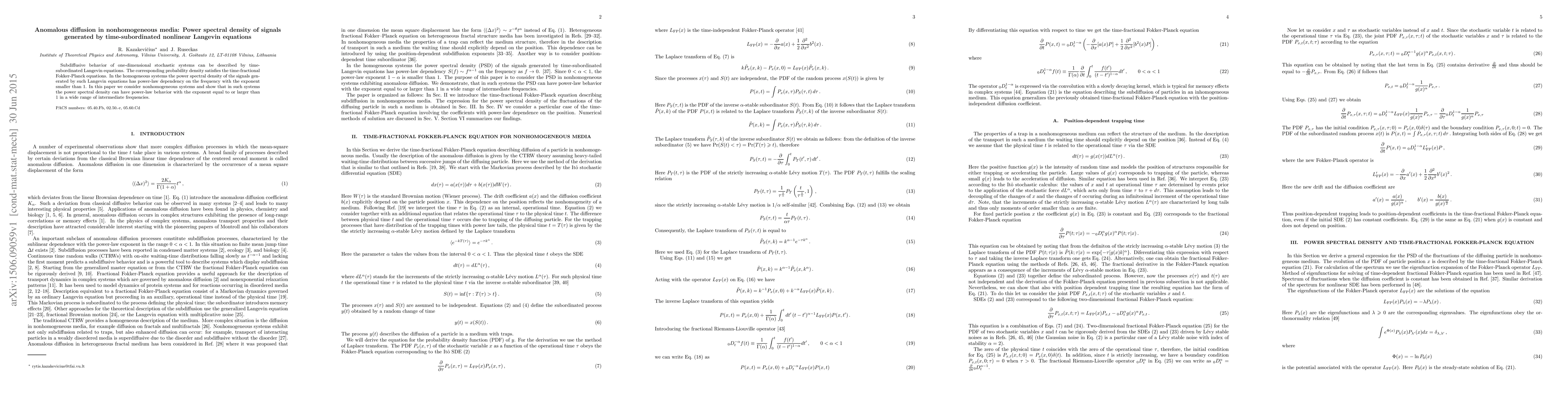 This paper explores anomalous diffusion in nonhomogeneous media through time-subordinated nonlinear Langevin equations, demonstrating that the power spectral density of generated signals can exhibit power-law behavior with an exponent equal to or greater than 1 across a broad range of intermediate frequencies, contrasting with the subdiffusive exponent in homogeneous systems.