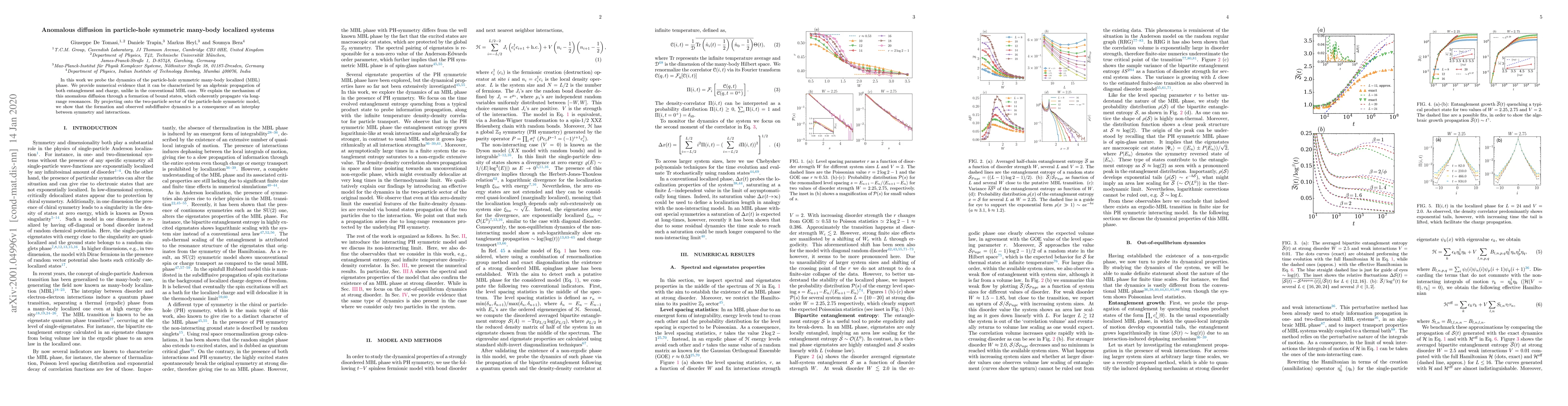 This paper investigates the dynamics of particle-hole symmetric many-body localized systems, revealing anomalous diffusion characterized by algebraic propagation of entanglement and charge, attributed to the formation of bound states via long-range resonances. The subdiffusive behavior is explained through the interplay between symmetry and interactions in the two-particle sector.