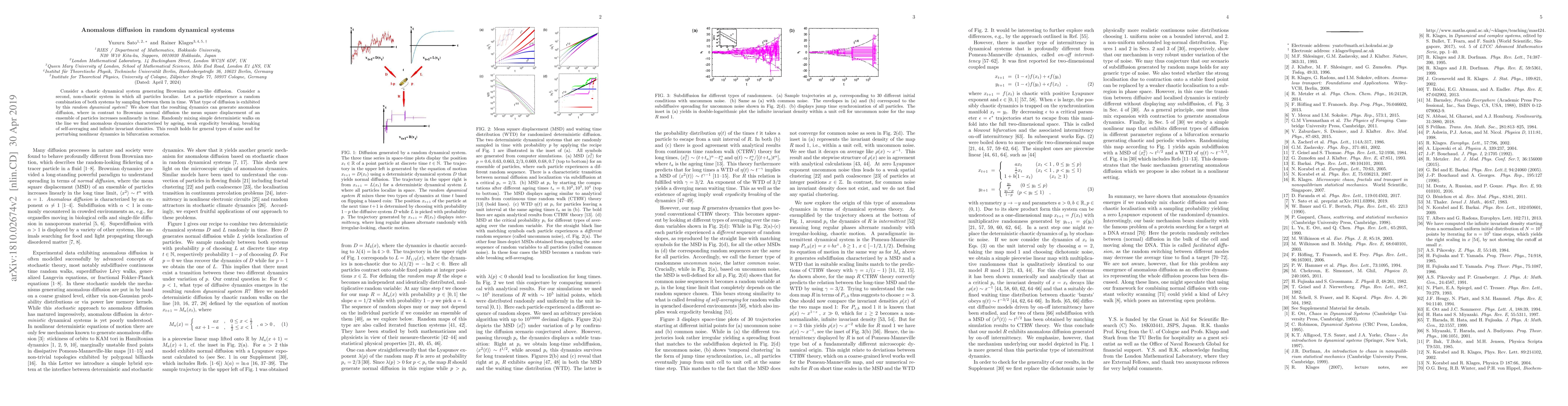 Consider a chaotic dynamical system generating Brownian motion-like diffusion. Consider a second, non-chaotic system in which all particles localize. Let a particle experience a random combination of both systems by sampling between them in time. What type of diffusion is exhibited by this {\em random dynamical system}? We show that the resulting dynamics can generate anomalous diffusion, where in contrast to Brownian normal diffusion the mean square displacement of an ensemble of particles increases nonlinearly in time. Randomly mixing simple deterministic walks on the line we find anomalous dynamics characterised by ageing, weak ergodicity breaking, breaking of self-averaging and infinite invariant densities. This result holds for general types of noise and for perturbing nonlinear dynamics in bifurcation scenarios.