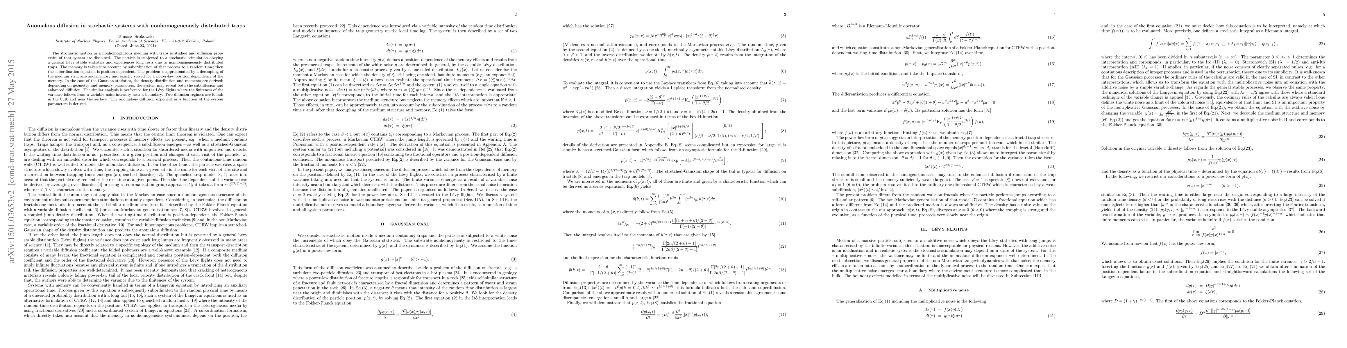 The stochastic motion in a nonhomogeneous medium with traps is studied and diffusion properties of that system are discussed. The particle is subjected to a stochastic stimulation obeying a general L\'evy stable statistics and experiences long rests due to traps the density of which depends on the position. The memory is taken into account by subordination of that process to a random time; then the subordination equation is position-dependent. The problem is approximated by means of a decoupling of the trap geometry and memory and exactly solved for a power-law trap density, corresponding to a fractal medium structure, in the case of the Gaussian statistics: the density distribution and moments are derived. Depending on geometry and memory parameters, the system may reveal both the subdiffusion and enhanced diffusion. A similar analysis is performed for the L\'evy flights where the finiteness of the variance follows from a multiplicative noise, as a result of impurities and defects at the boundary. Two diffusion regimes are found: in the bulk and near the surface. The anomalous diffusion exponent as a function of the system parameters is derived.