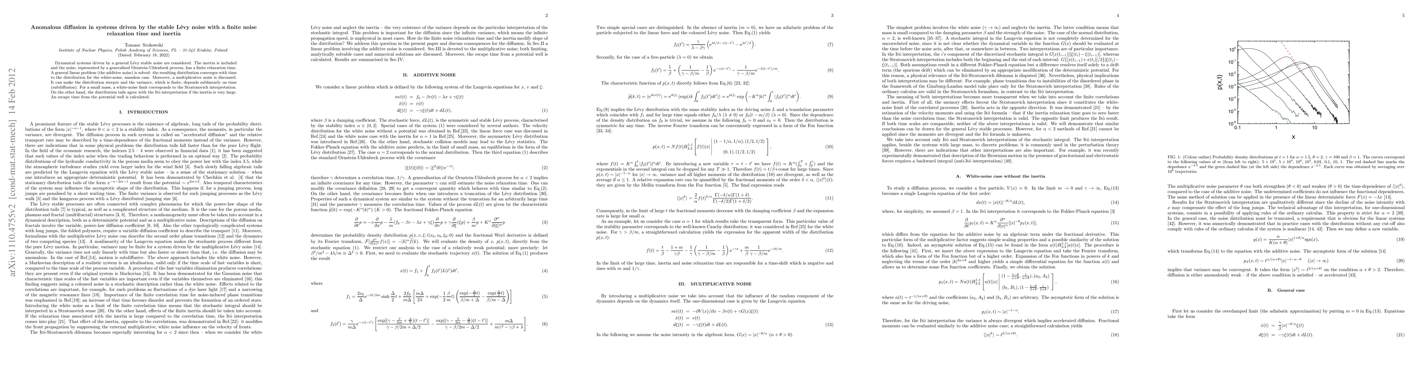 Dynamical systems driven by a general L\'evy stable noise are considered. The inertia is included and the noise, represented by a generalised Ornstein-Uhlenbeck process, has a finite relaxation time. A general linear problem (the additive noise) is solved: the resulting distribution converges with time to the distribution for the white-noise, massless case. Moreover, a multiplicative noise is discussed. It can make the distribution steeper and the variance, which is finite, depends sublinearly on time (subdiffusion). For a small mass, a white-noise limit corresponds to the Stratonovich interpretation. On the other hand, the distribution tails agree with the Ito interpretation if the inertia is very large. An escape time from the potential well is calculated.