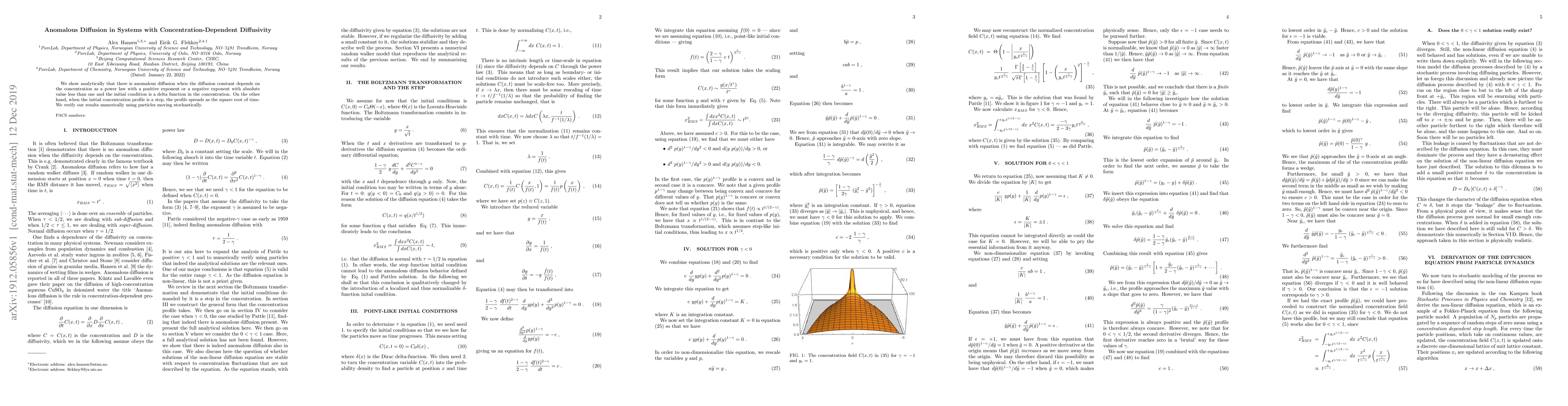 We show analytically that there is anomalous diffusion when the diffusion constant depends on the concentration as a power law with a positive exponent or a negative exponent with absolute value less than one and the initial condition is a delta function in the concentration. On the other hand, when the initial concentration profile is a step, the profile spreads as the square root of time. We verify our results numerically using particles moving stochastically.