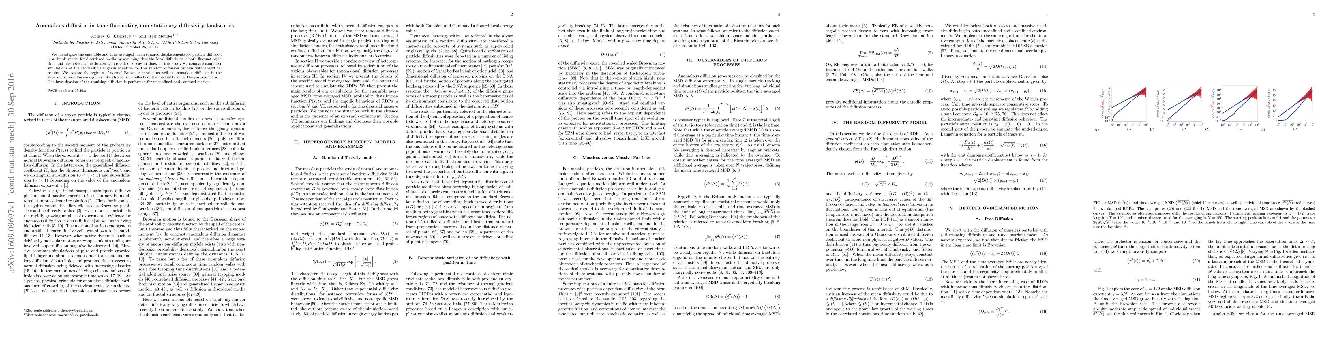 We investigate the ensemble and time averaged mean squared displacements for particle diffusion in a simple model for disordered media by assuming that the local diffusivity is both fluctuating in time and has a deterministic average growth or decay in time. In this study we compare computer simulations of the stochastic Langevin equation for this random diffusion process with analytical results. We explore the regimes of normal Brownian motion as well as anomalous diffusion in the sub- and superdiffusive regimes. We also consider effects of the inertial term on the particle motion. The investigation of the resulting diffusion is performed for unconfined and confined motion.