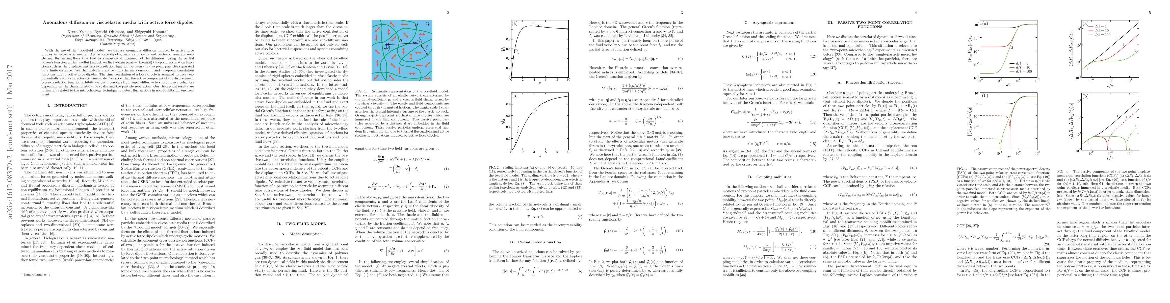This paper explores anomalous diffusion in viscoelastic media driven by active force dipoles using a two-fluid model. It reveals how active components, such as proteins and bacteria, induce non-thermal flows, leading to complex diffusion behaviors, including super-diffusive and sub-diffusive crossovers, which are detectable via microrheology.