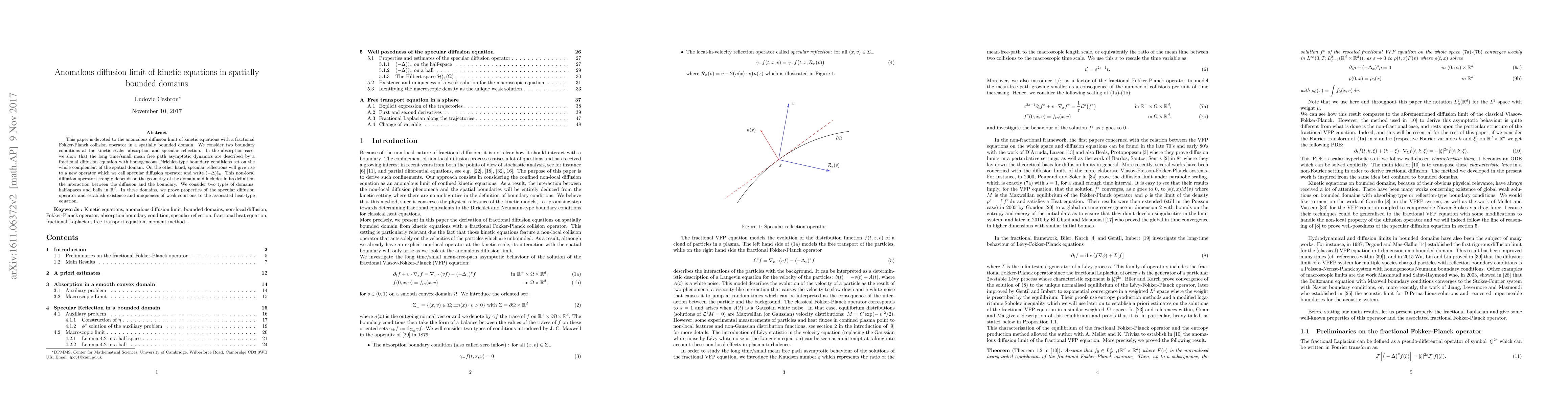 This paper is devoted to the anomalous diffusion limit of kinetic equations with a fractional Fokker-Planck collision operator in a spatially bounded domain. We consider two boundary conditions at the kinetic scale: absorption and specular reflection. In the absorption case, we show that the long time/small mean free path asymptotic dynamics are described by a fractional diffusion equation with homogeneous Dirichlet-type boundary conditions set on the whole complement of the spatial domain. On the other hand, specular reflections will give rise to a new operator which we call specular diffusion operator and write $(-\Delta)_{\text{SR}}^s$. This non-local diffusion operator strongly depends on the geometry of the domain and includes in its definition the interaction between the diffusion and the boundary. We consider two types of domains: half-spaces and balls in $\mathbb{R}^d$. In these domains, we prove properties of the specular diffusion operator and establish existence and uniqueness of weak solutions to the associated heat-type equation.
