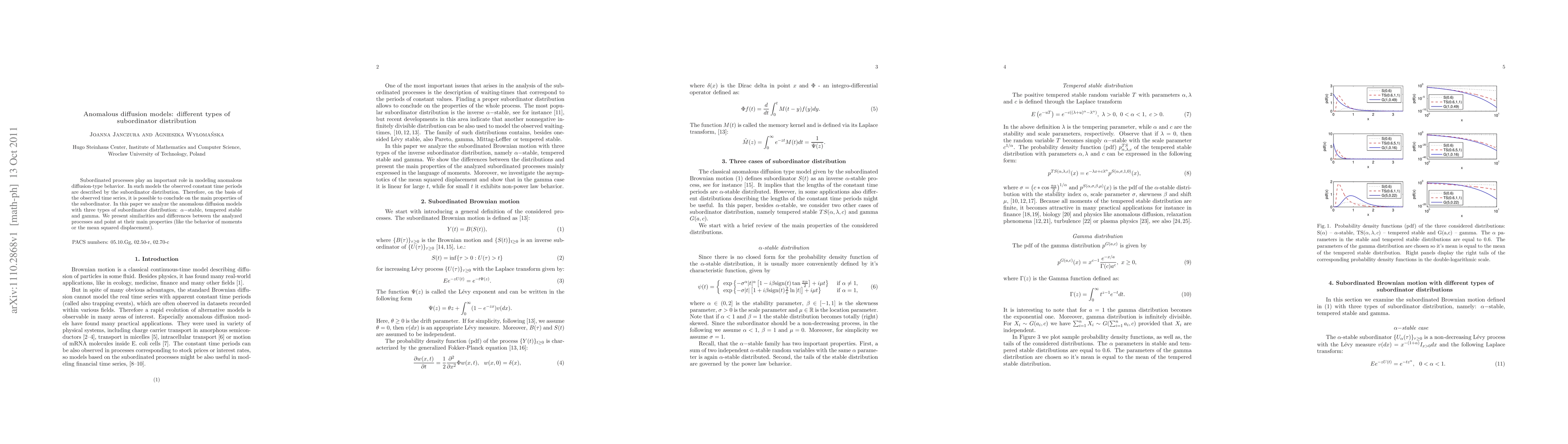Subordinated processes play an important role in modeling anomalous diffusion-type behavior. In such models the observed constant time periods are described by the subordinator distribution. Therefore, on the basis of the observed time series, it is possible to conclude on the main properties of the subordinator. In this paper we analyze the anomalous diffusion models with three types of subordinator distribution: \alpha-stable, tempered stable and gamma. We present similarities and differences between the analyzed processes and point at their main properties (like the behavior of moments or the mean squared displacement).
