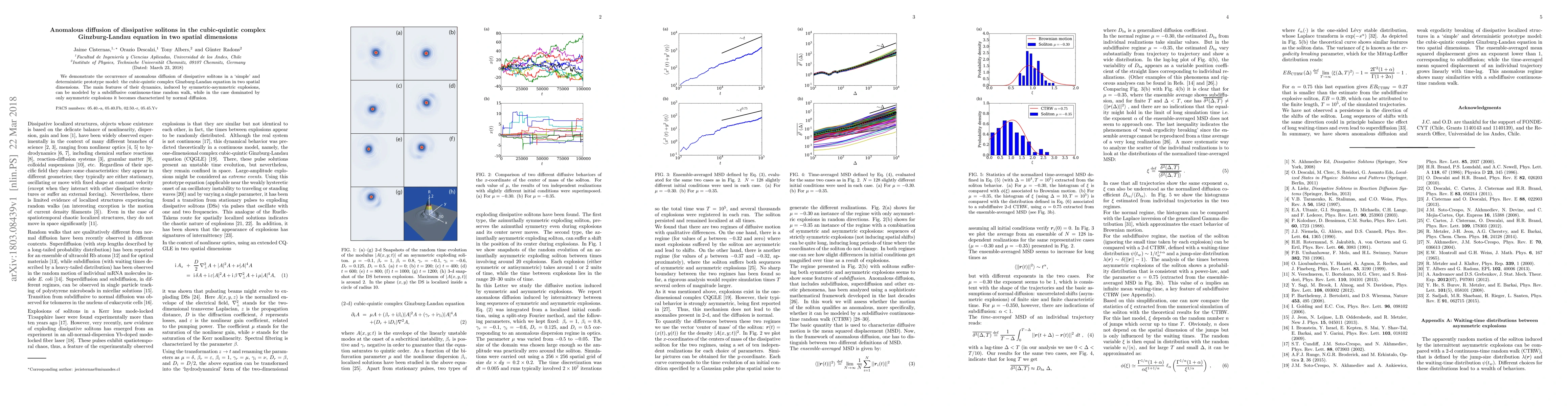 We demonstrate the occurrence of anomalous diffusion of dissipative solitons in a `simple' and deterministic prototype model: the cubic-quintic complex Ginzburg-Landau equation in two spatial dimensions. The main features of their dynamics, induced by symmetric-asymmetric explosions, can be modeled by a subdiffusive continuous-time random walk, while in the case dominated by only asymmetric explosions it becomes characterized by normal diffusion.
