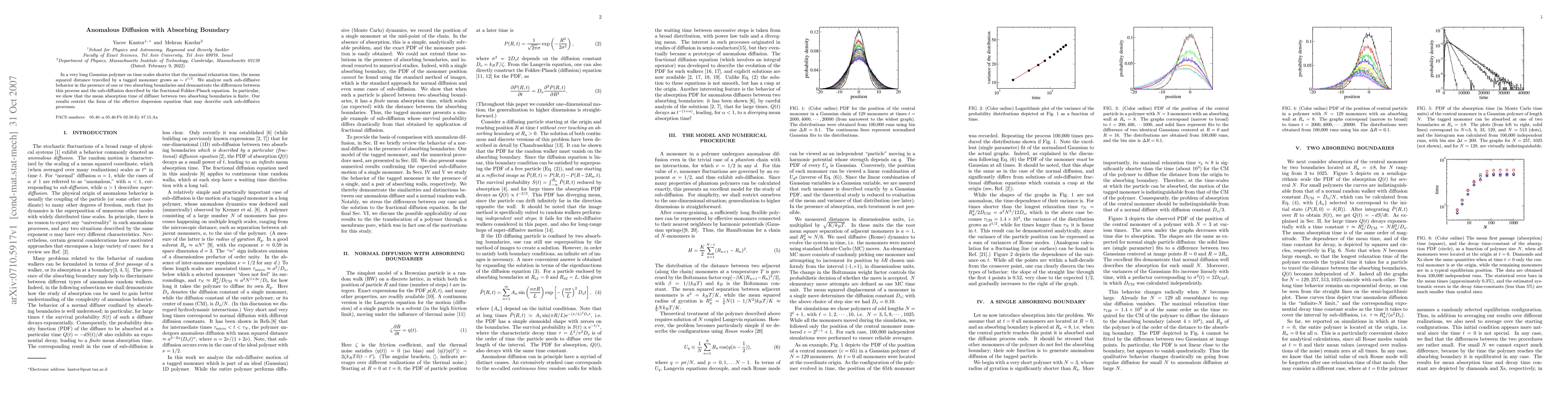 This paper investigates anomalous diffusion in long Gaussian polymers with absorbing boundaries, showing that the mean squared distance grows as ~t^{1/2} on short timescales. It contrasts this sub-diffusion with the fractional Fokker-Planck equation and demonstrates finite mean absorption time between two boundaries, thereby restricting the effective dispersion equation for such processes.