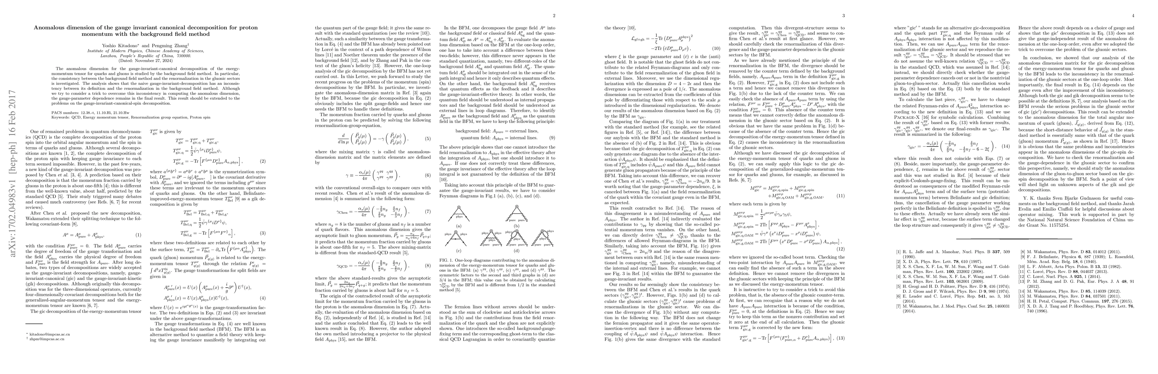 This paper investigates the anomalous dimension of the gauge-invariant canonical decomposition of the proton's momentum using the background field method, revealing an inconsistency between its definition and renormalization. Despite attempts to resolve this issue, gauge-parameter dependence persists in the final results, suggesting further study for gauge-invariant-canonical-spin decomposition.