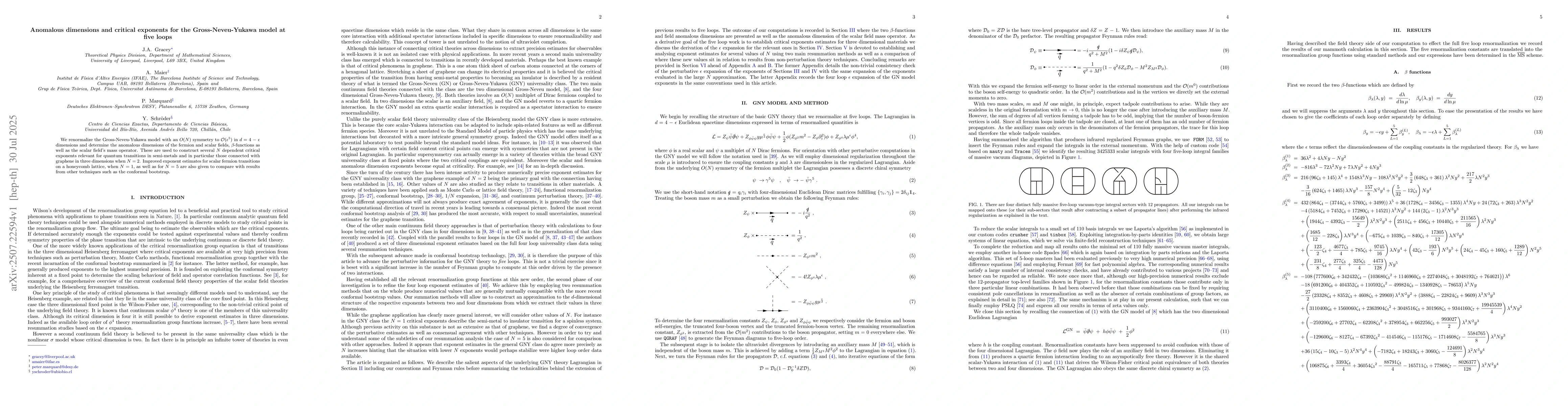 The paper presents detailed five-loop renormalization group functions for the GNY model, advancing the perturbative understanding of critical exponents in O(N) symmetric theories.