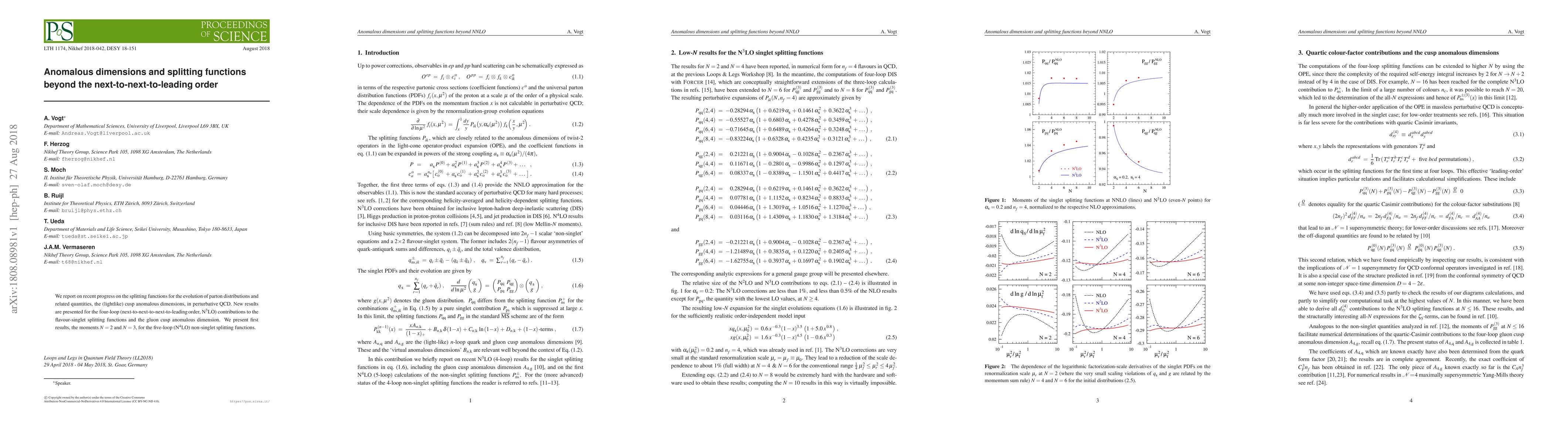 We report on recent progress on the splitting functions for the evolution of parton distributions and related quantities, the (lightlike) cusp anomalous dimensions, in perturbative QCD. New results are presented for the four-loop (next-to-next-to-next-to-leading order, N^3LO) contributions to the flavour-singlet splitting functions and the gluon cusp anomalous dimension. We present first results, the moments N=2 and N=3, for the five-loop (N^4LO) non-singlet splitting functions.