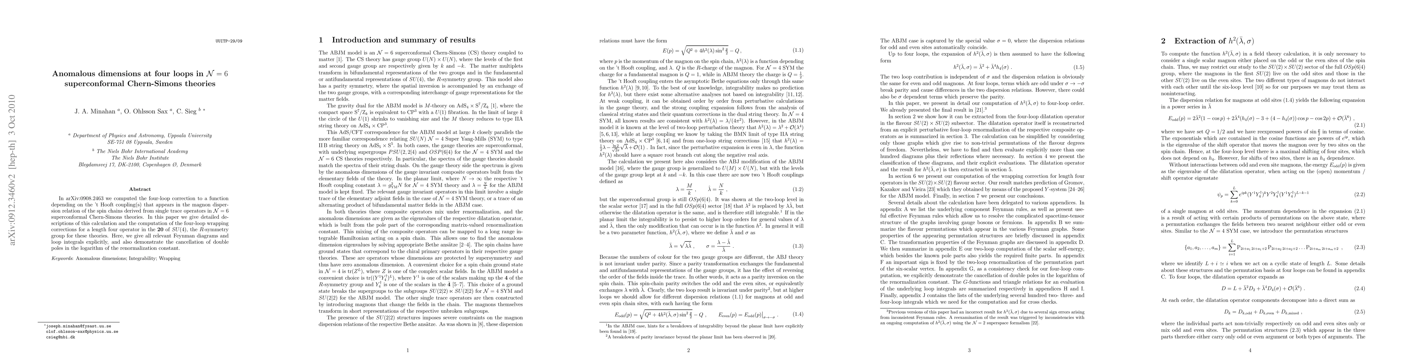 In arXiv:0908.2463 we computed the four-loop correction to a function depending on the 't Hooft coupling(s) that appears in the magnon dispersion relation of the spin chains derived from single trace operators in N=6 superconformal Chern-Simons theories. In this paper we give detailed descriptions of this calculation and the computation of the four-loop wrapping corrections for a length four operator in the 20 of SU(4), the R-symmetry group for these theories. Here, we give all relevant Feynman diagrams and loop integrals explicitly, and also demonstrate the cancellation of double poles in the logarithm of the renormalization constant.