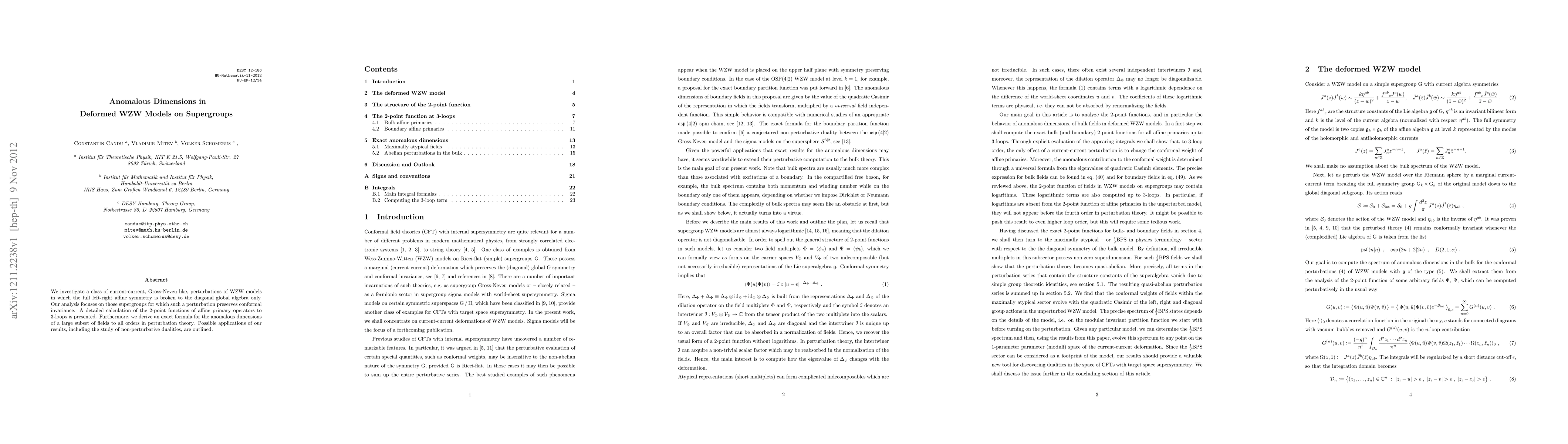 This paper examines current-current perturbations of WZW models on supergroups that preserve conformal invariance, presenting a detailed calculation of 2-point functions to 3-loops and deriving an exact formula for the anomalous dimensions of fields to all orders in perturbation theory. Potential applications include exploring non-perturbative dualities.