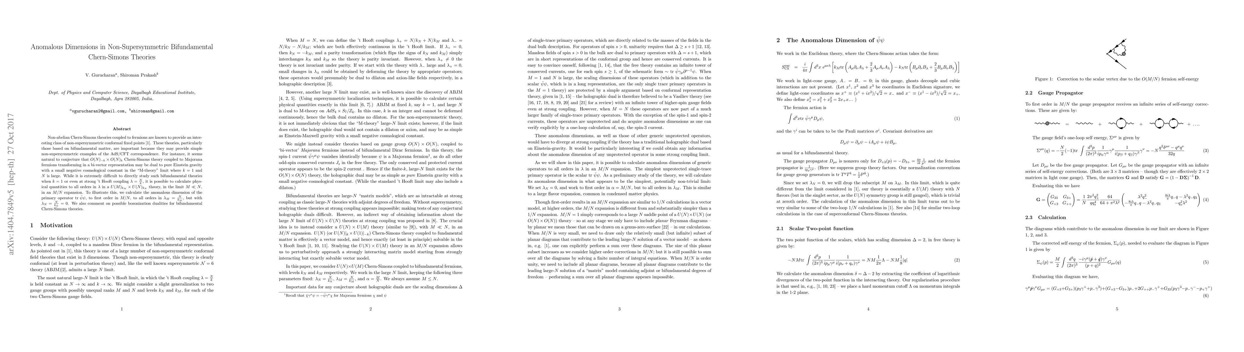 Non-abelian Chern-Simons theories coupled to fermions are known to provide an interesting class of non-supersymmetric conformal fixed points \cite{Giombi:2011kc}. These theories, particularly those based on bifundamental matter, are important because they may provide simple non-supersymmetric examples of the AdS/CFT correspondence. For instance, it seems natural to conjecture that $O(N)_{-k}\times O(N)_k$ Chern-Simons theory coupled to Majorana fermions transforming in a bi-vector representation may be dual to pure Einstein gravity with a small negative cosmological constant in the "M-theory" limit where $k=1$ and $N$ is large. While it is extremely difficult to directly study such bifundamental theories when $k=1$ or even at strong 't Hooft coupling $\lambda=\frac{N}{k}$, it is possible to calculate physical quantities to all orders in $\lambda$ in a $U(M)_{k_M} \times U(N)_{k_N}$ theory, in the limit $M \ll N$, in an $M/N$ expansion. To illustrate this, we calculate the anomalous dimension of the primary operator $\bar{\psi}{\psi}$, to first order in $M/N$, to all orders in $\lambda_M=\frac{N}{k_M}$, but with $\lambda_N=\frac{N}{k_N}=0$. We also comment on possible bosonization dualities for bifundamental Chern-Simons theories.