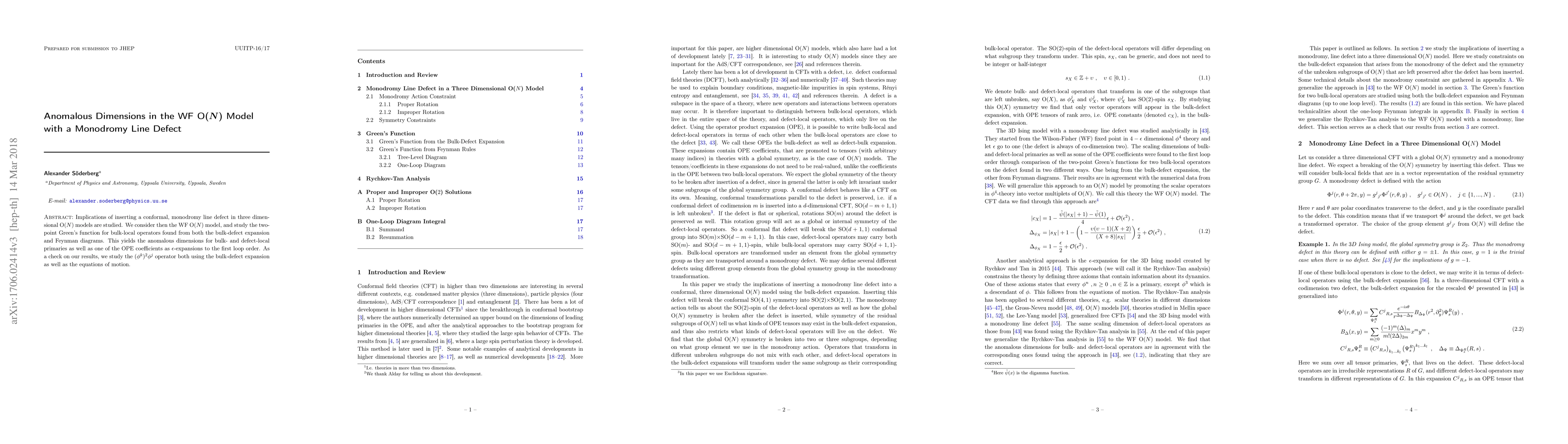 Implications of inserting a conformal, monodromy line defect in three dimensional O($N$) models are studied. We consider then the WF O($N$) model, and study the two-point Green's function for bulk-local fields found from both the bulk-defect expansion and Feynman diagrams. This yields the anomalous dimensions for bulk- and defect-local primaries as well as one of the OPE coefficients as $\epsilon$-expansions to the first loop order. As a check on our results, we study the $(\phi^k)^2{\phi}^j$ operator both using the bulk-defect expansion as well as the equations of motion.